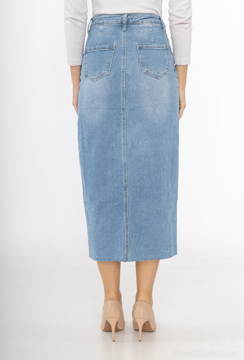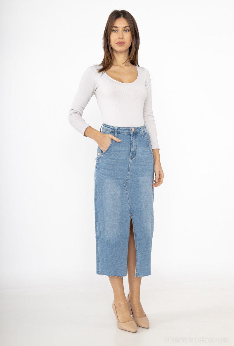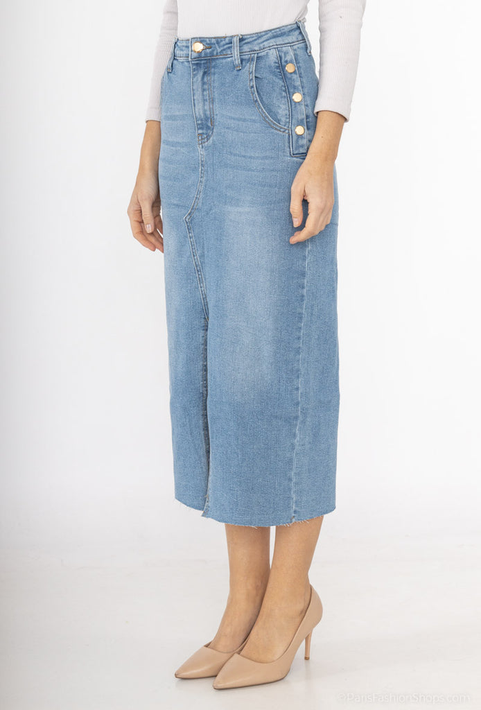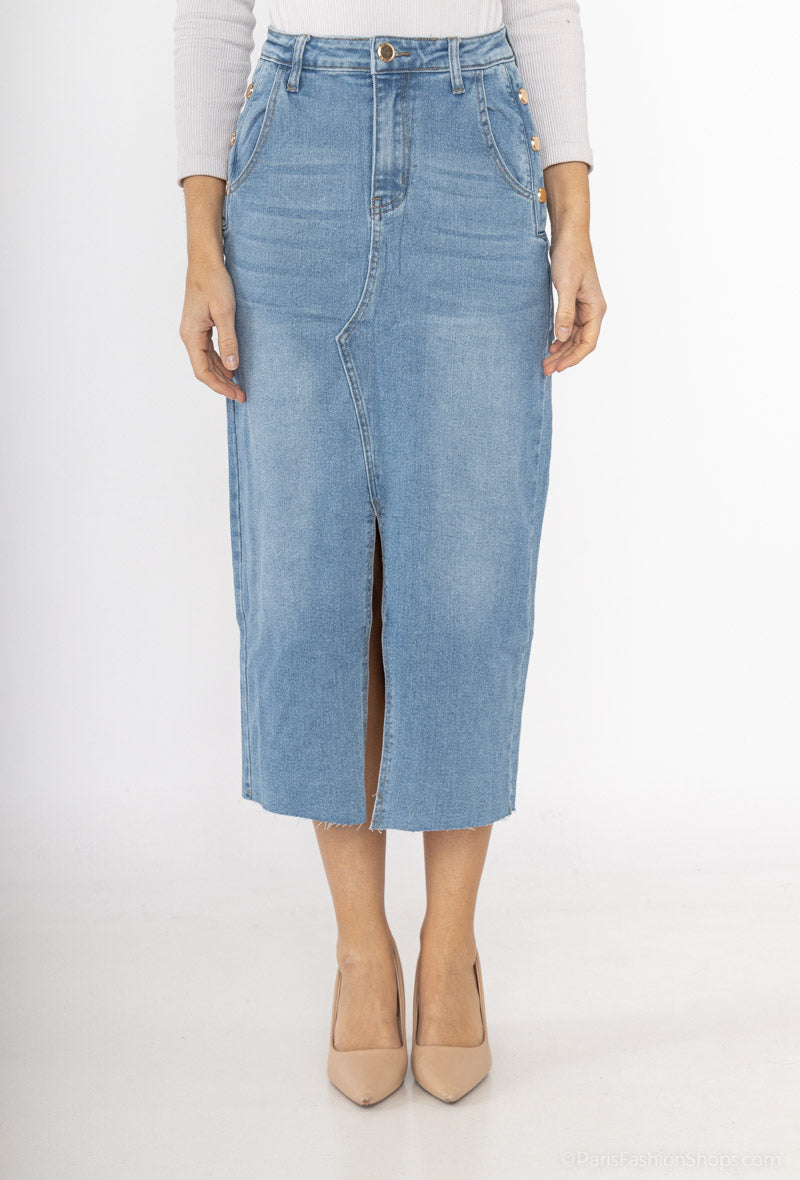 Lækker stretchy denim nederdel med knapper i siden fra Emsig Exclusive.