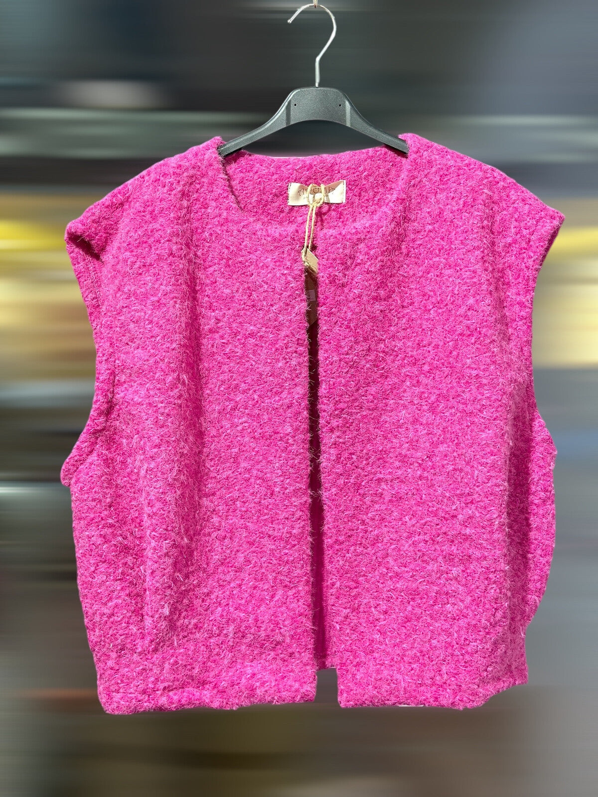 Skøn åbenstående filt-vest fra "Emsig Exclusive" i en flot stærk pink farve. Vesten har en løs pasform og er i en lækker kvalitet. Vesten har lommer i siderne og kan styles på mange måder.