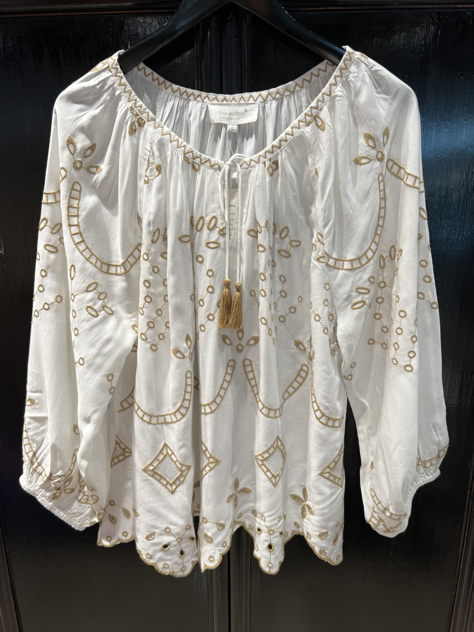 Super smuk bluse fra Eva Go Diva. Blusen er hvid og har smukke broderi detaljer.