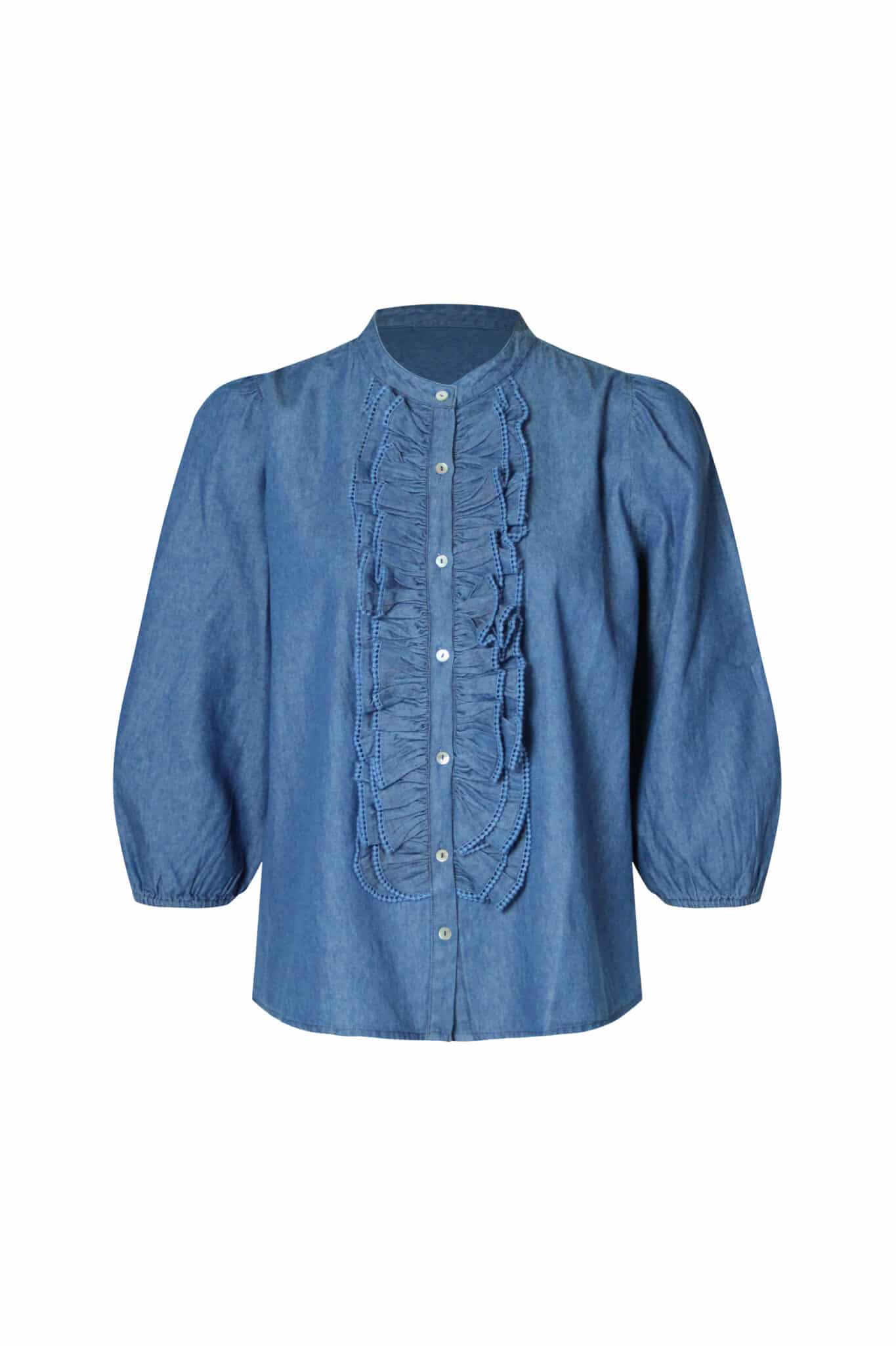 Skjorte i denim blå med 3/4 ærmer og flæse detaljer - i den blødeste kvalitet.