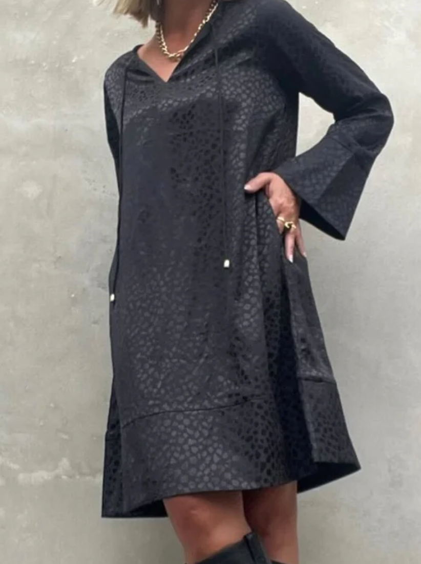 Smuk kort kjole fra Gaspar med lommer i siden og let a-skåret med snørelukning foran. Kjolen har v-udskæring og ærmer med brede manchetter.
