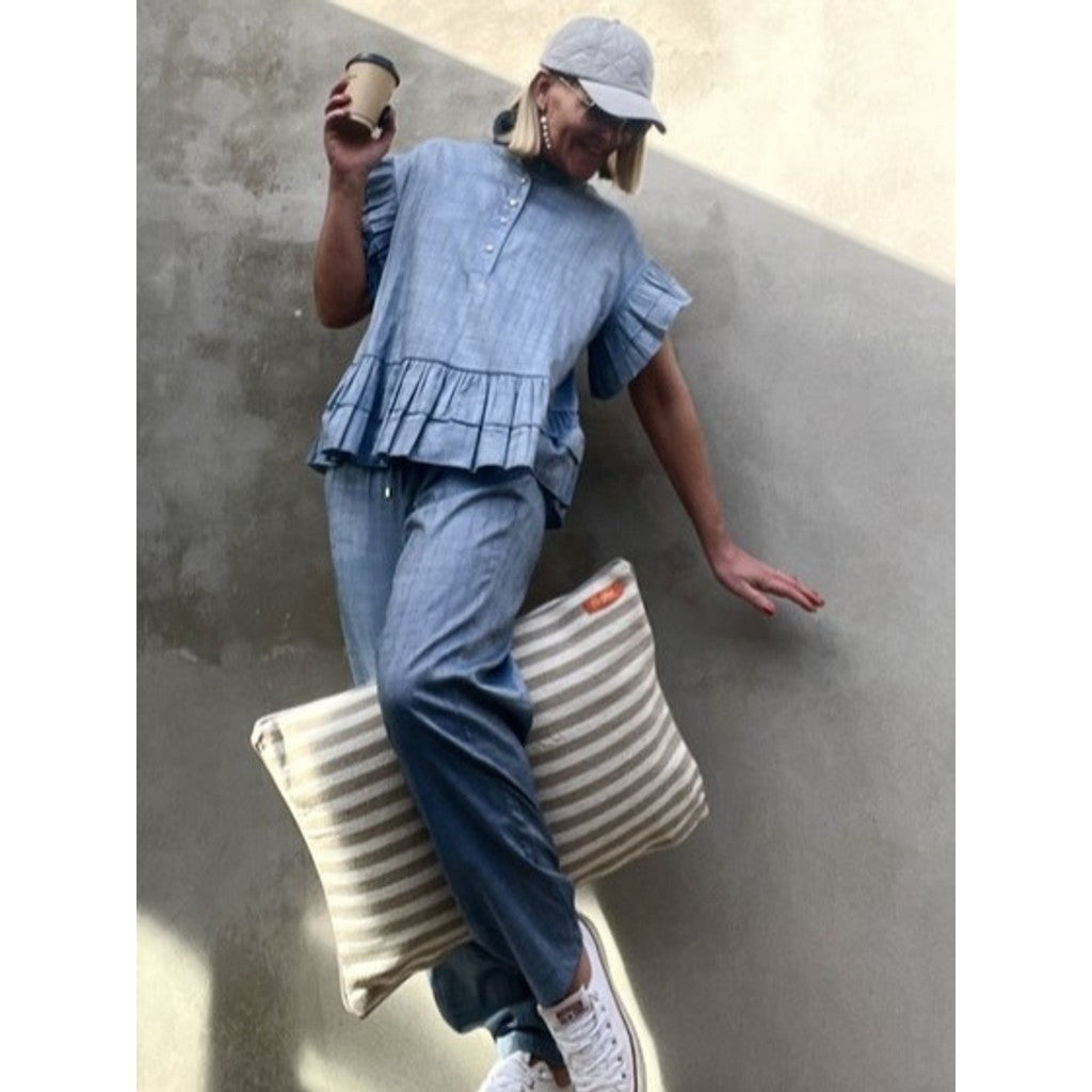 Fineste buks i meleret blå farve, med tynd blå lurexstrib. Kommer med elastik i taljen og snørre, samt skrålommer foran. Elastik i bunden af buksen, på bagsiden.