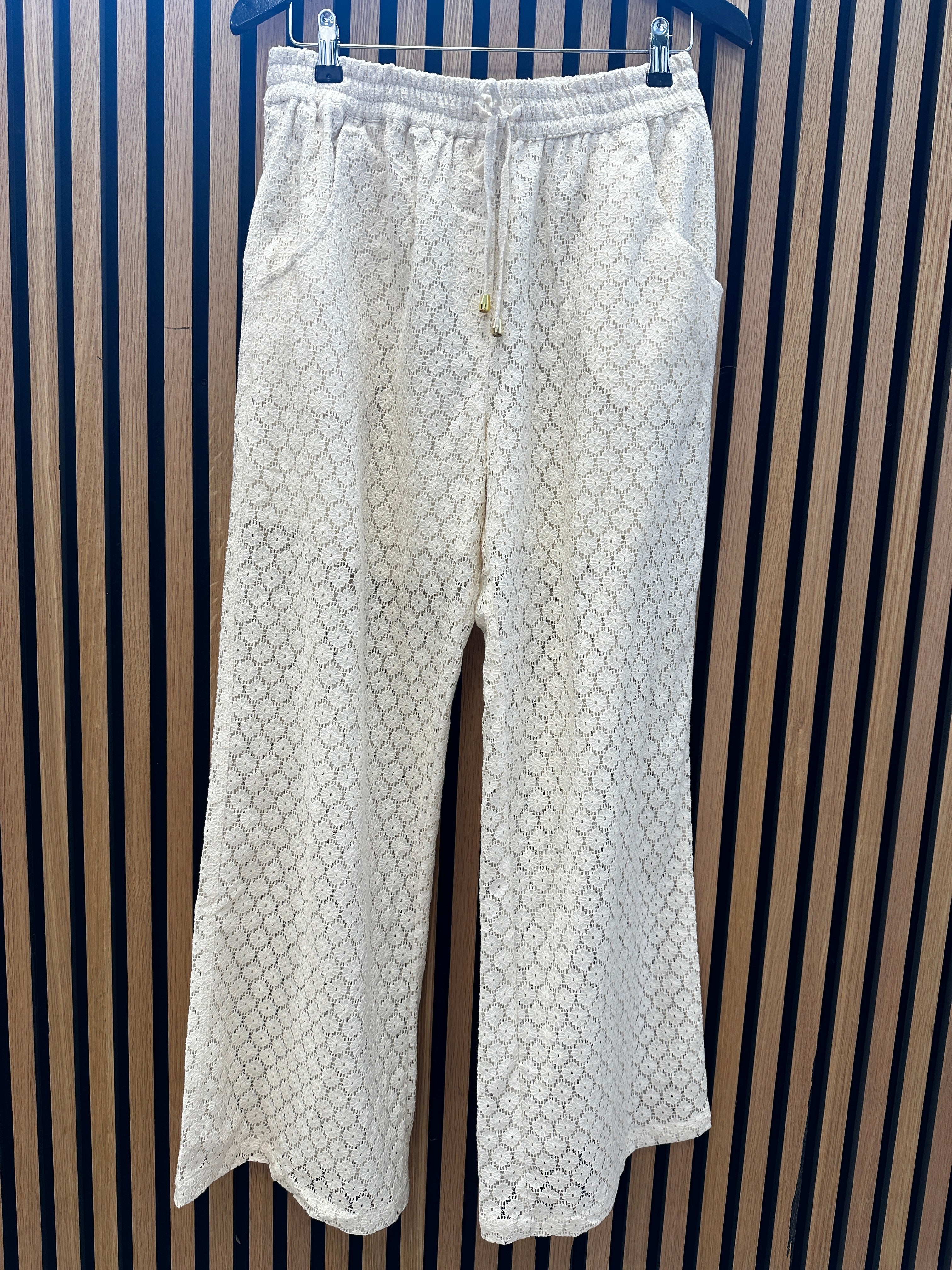 De fineste blondebukser i en lækker off white. Buksen har elastik i taljen med bindebånd, og en "indershorts" så de ikke bliver gennemsigtige det øverste stykke. Perfekt til sommerens mange fester med en smuk top til, hverdagen med en rå t-shirt eller på ferien med en bikinitop.