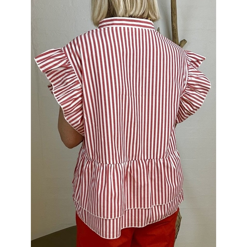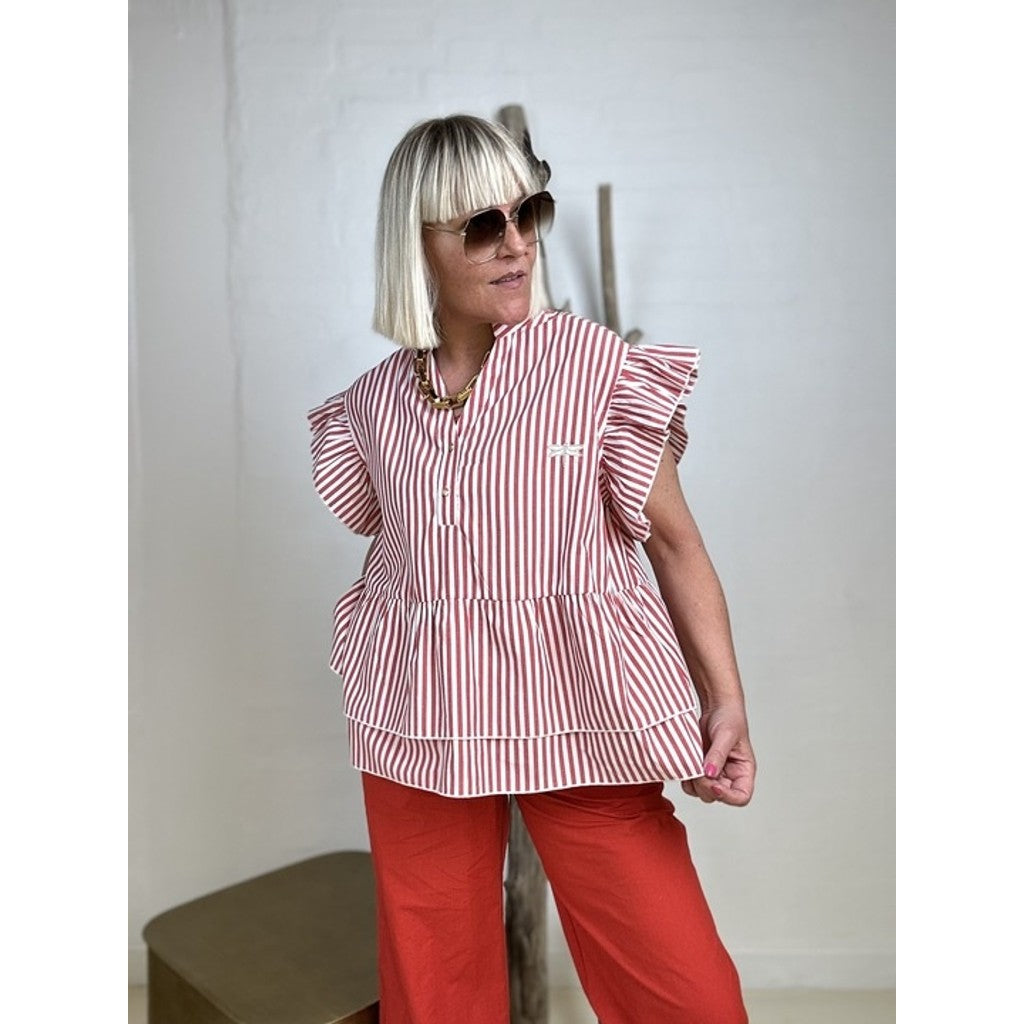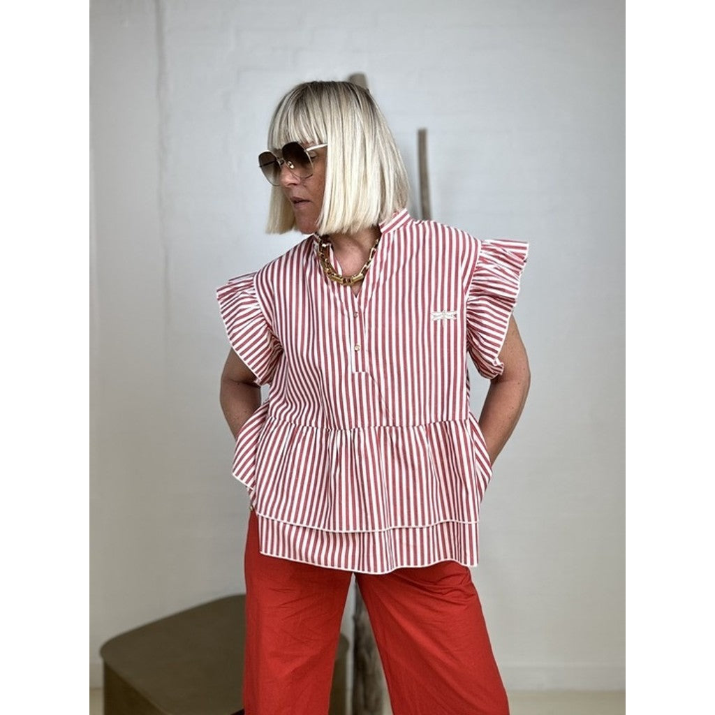 Feminin bluse i a-skåret model fra Gaspar. Blusen har V udskæring foran med matte guldknapper, dropped skuldre med flæsedetalje, og flæsedetalje i bunden.