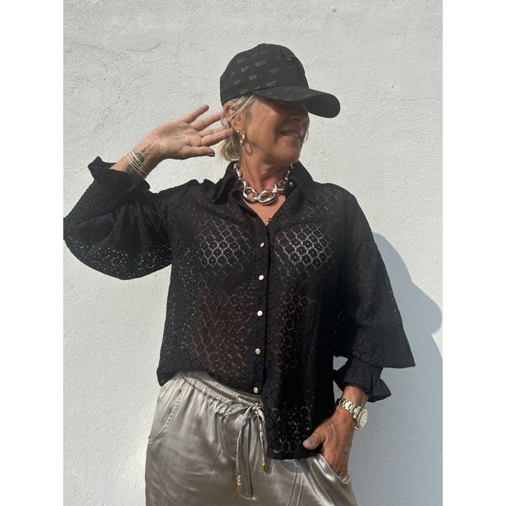 Skøn feminin blondebluse fra Gaspar i ren bomuld. Blusen har de fineste guldknapper fortil og elastik ved ærmeafslutning der giver ærmerne let balloneffekt.