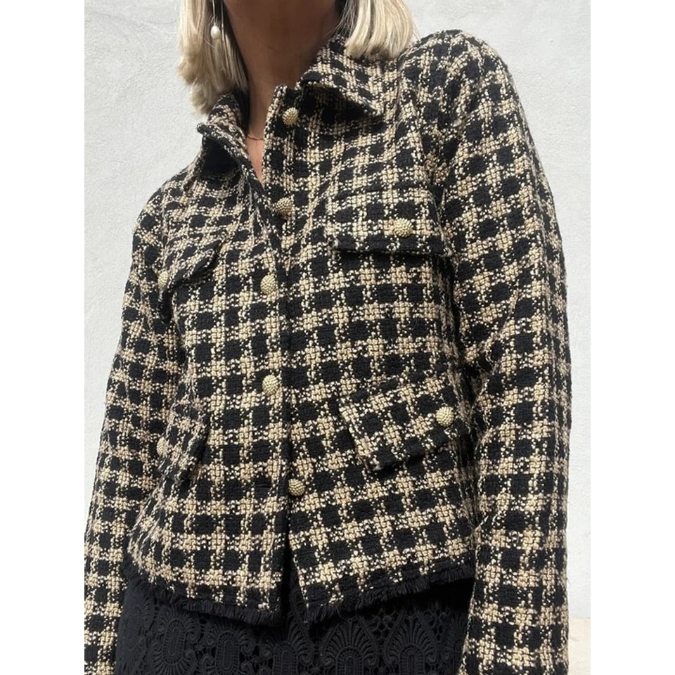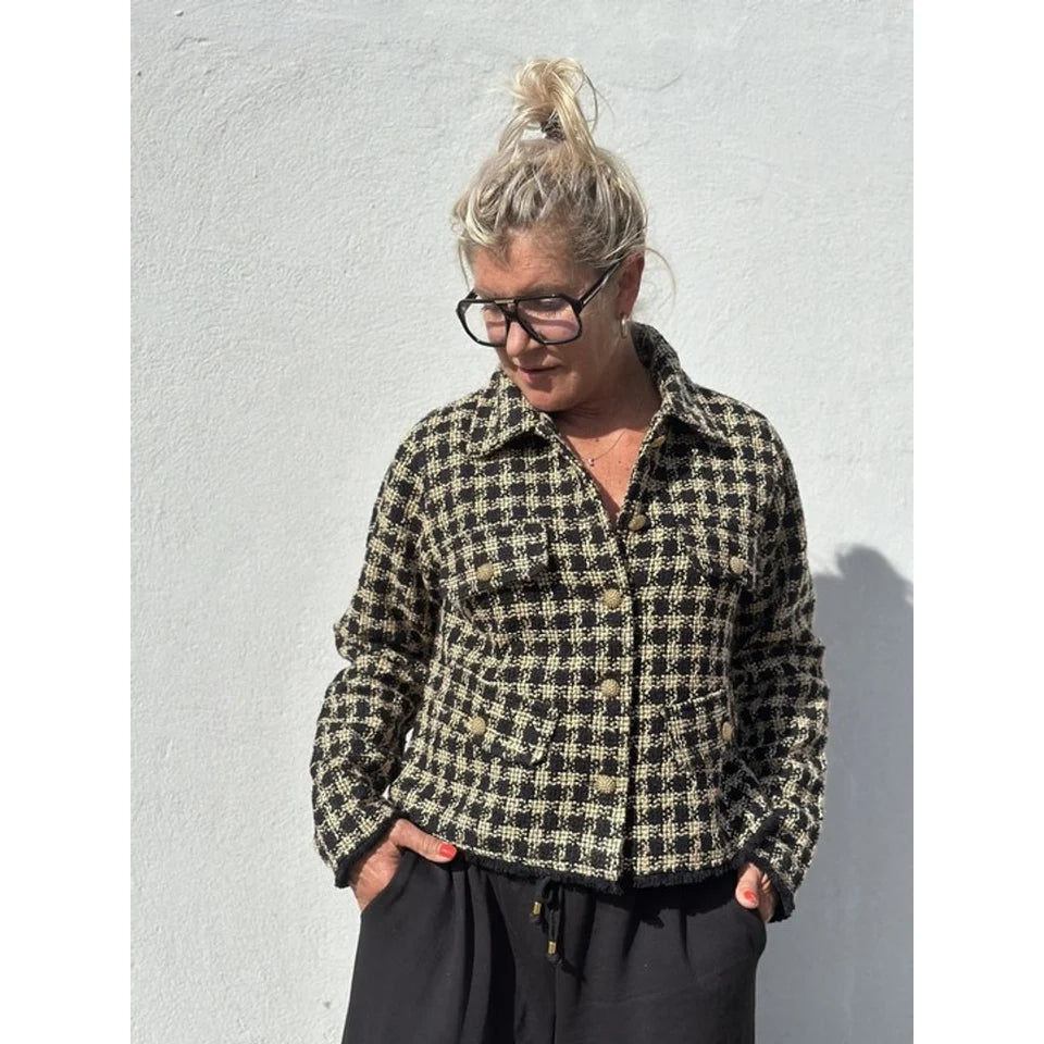 Cool og fitted kort jakke fra Gaspar. Det smukke foer sætter prikken over i'et. Jakken har fire lommeklapper, som blot er til detalje og så er den med chunky guldknapper.