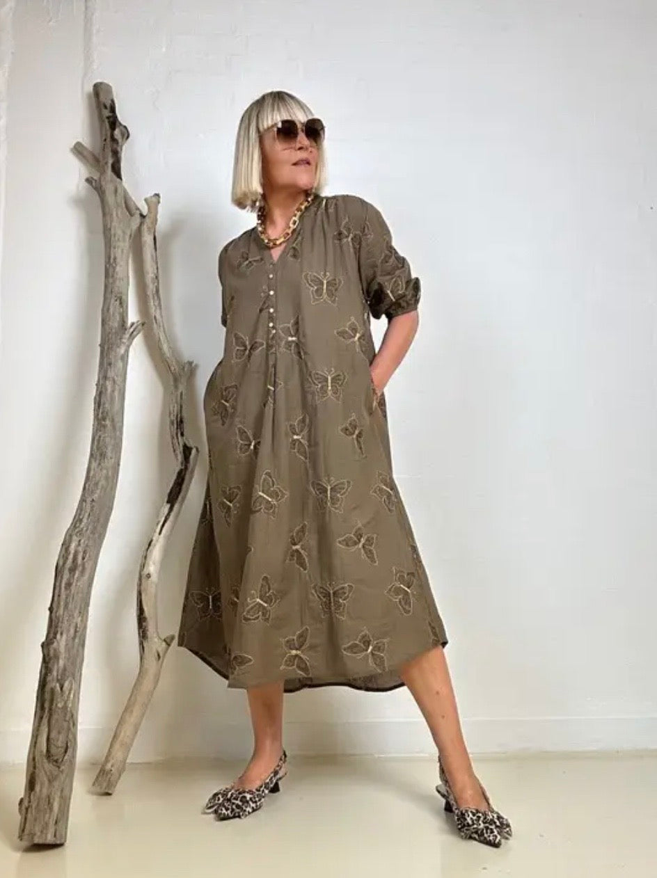 Drøm dig væk til solrige dage i denne smukke sommerkjole fra GASPAR. Love Butterfly Dress i taupe er pyntet med fine broderede sommerfugle i bløde, farverige nuancer – en kjole der emmer af lethed, femininitet og personlig stil. Det løse, luftige snit gør den perfekt til varme sommerdage, hvor komfort og elegance går hånd i hånd.
