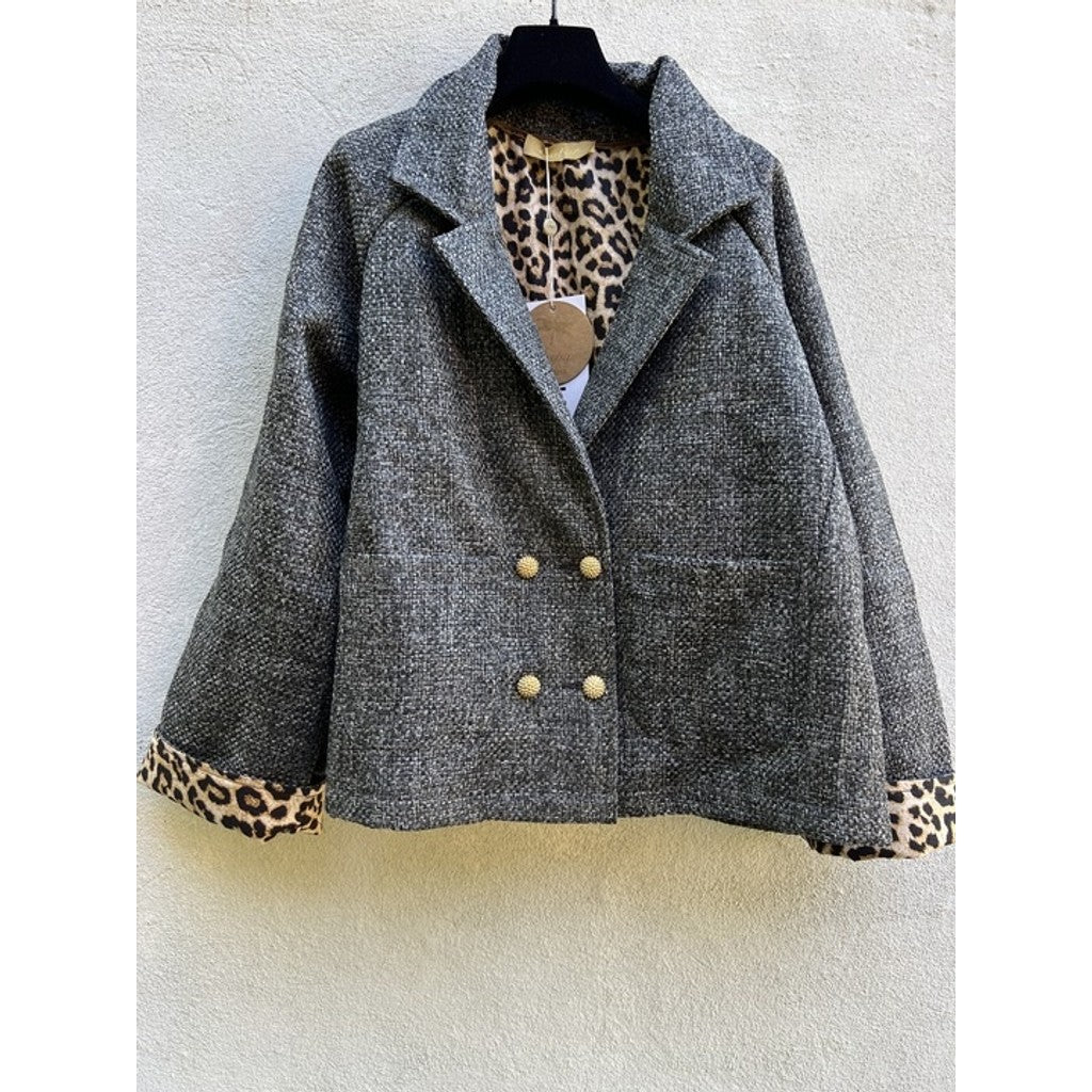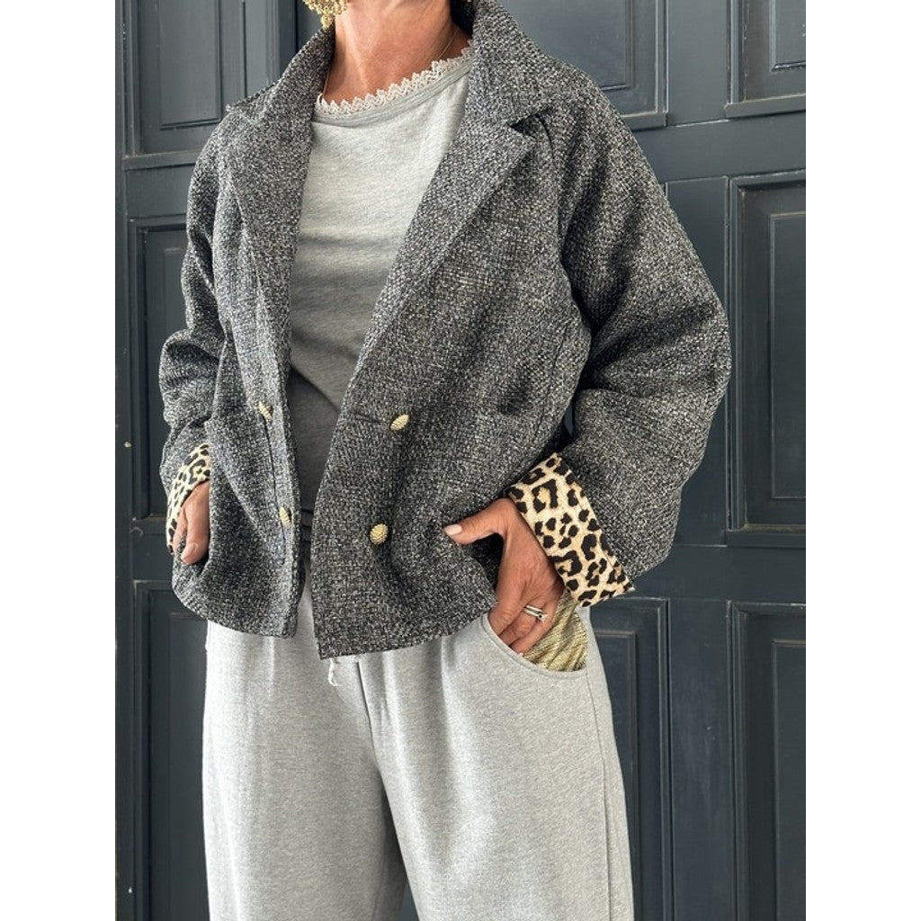 Lækker jakke fra Gaspar i en flot grå meleret farve med guldknapper. Jakken har en let A-facon med leopard foer på indersinden, har 2 knapper foran og 2 frontlommer.
