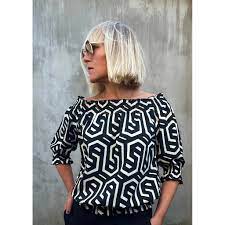 Skønneste off-shoulder bluse fra Gaspar med blød elastik. Blusen har et flot grafisk print, bred udskæring og elastik med smock ved afslutning.