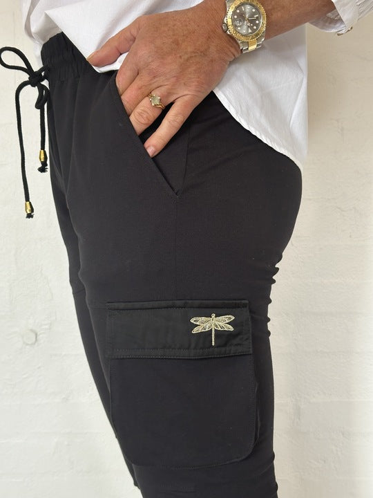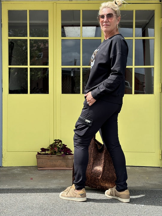 Så cool en buks fra Gaspar i det blødeste jersey materiale. Bukserne har høj talje med snøre, skrålommer og store lommer på siderne der giver et rå "cargo" look.