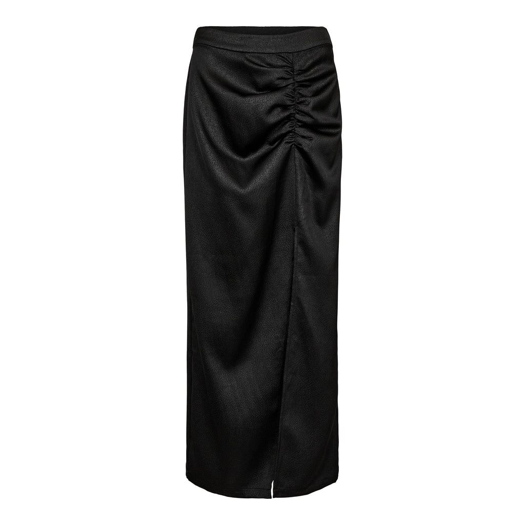 Smuk nederdel med høj slids og flot drapering fra Haute L'amitié. Nederdelen har blød elastik i taljen og falder smukt langs kroppen. I en smuk sort med tone i tone mønster og med diskret lynlåslukning i siden.