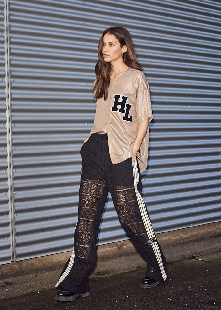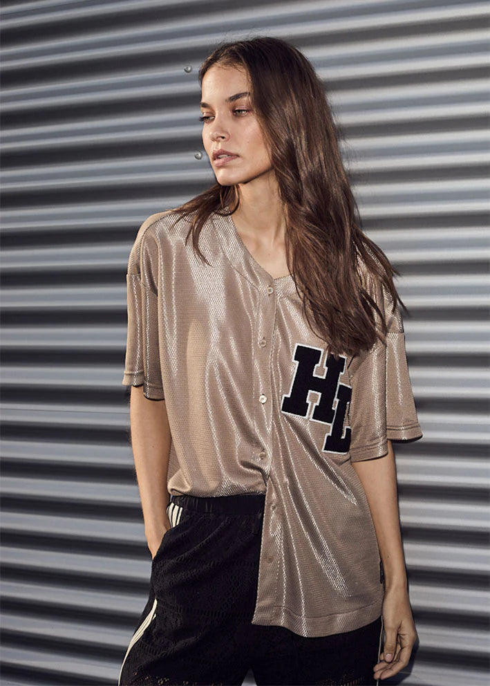 Sporty og eksklusiv t-shirt fra Haute L'amitié i et elegant design med transparent mesh. T-shirten har v-udskæring, korte ærmer og knapper ned foran samt en løs pasform.