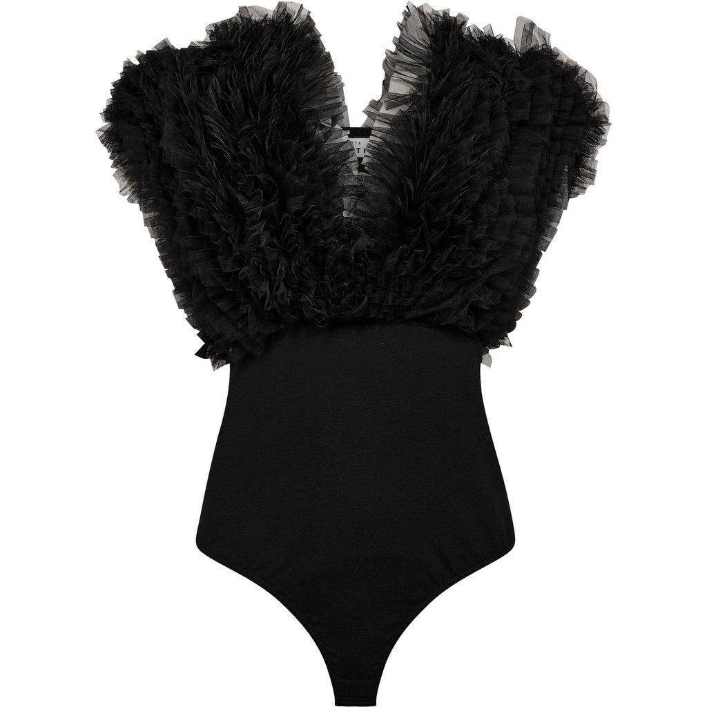 Den vildeste bodystocking fra Haute l'amitié!! Her får man virkelig en showstopper, og et stykke tøj som kan dresse ethvert outfit op. Toppen er lavet med en volumiøs overdel i tyl og et helt basic stramt stykke fra under barmen.