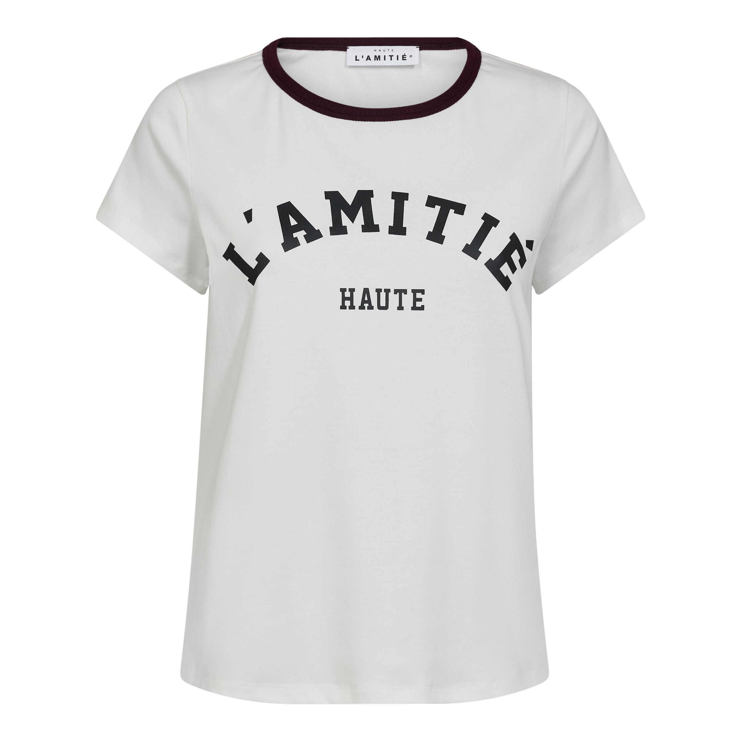 Skønneste t-shirt med rund hals og kort ærme. Kanten i halsen er bordeaux og skriften er sort. Helt normal i størrelsen .