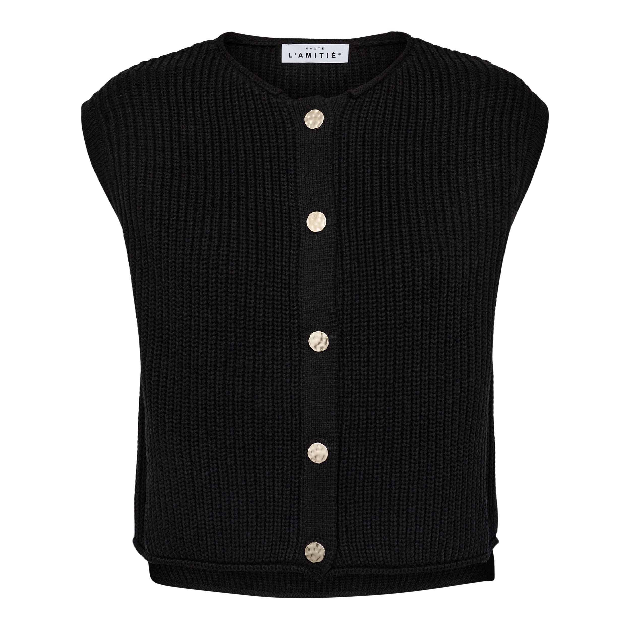 Lækker strikket vest fra Haute L'amitie i klassisk sort. Vesten er i en skøn bomuldsmix og lukkes fortil med guldknapper.