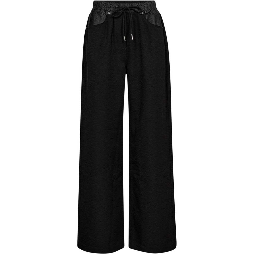 Top cool vidde buks fra Haute L'amitié med habitstof i det meste af buksen og en rå grå denimdetalje oppe ved taljen. Buksen har desuden elastik og bindebånd i taljen, samt lommer både fortil og bagpå.