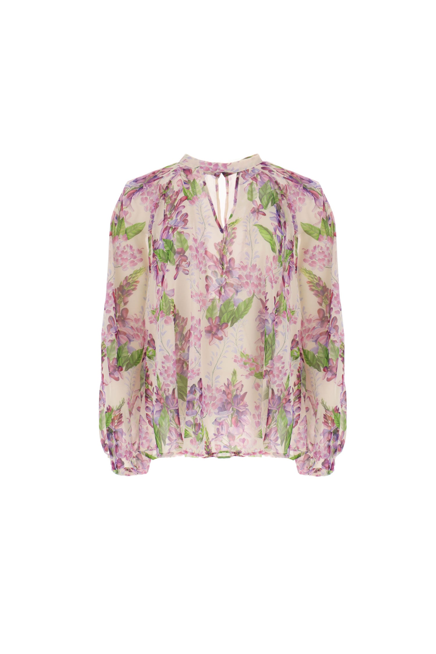 Super smuk bluse i let chiffon med det fineste print. Med lille v-detalje i halsen, lange ærmer og løs pasform.