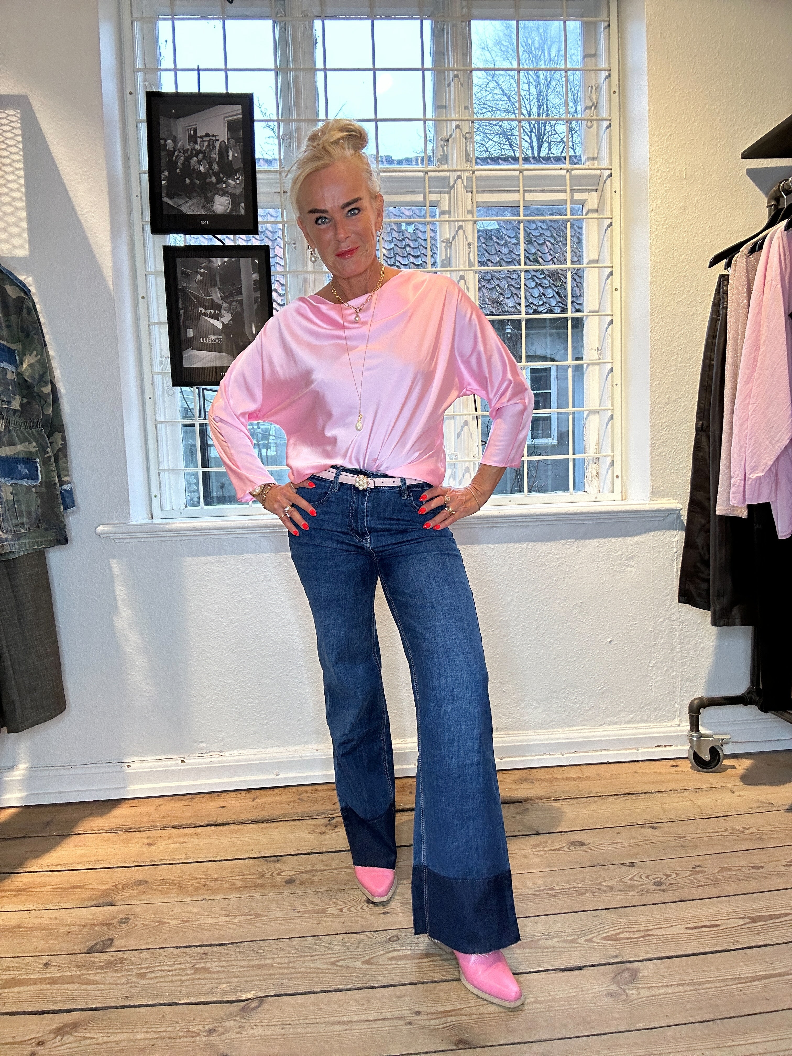 Smuk satin bluse fra italienske Imperial i deres velkendte strygefri kvalitet. Blusen har vandfaldsudskæring ved halsen og falder flot nedover skulderen, som ender ud i et 3/4 ærme.