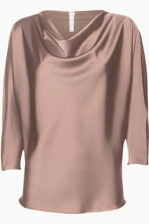 Smuk satin bluse fra italienske Imperial i deres velkendte strygefri kvalitet. Blusen har vandfaldsudskæring ved halsen og falder flot nedover skulderen, som ender ud i et 3/4 ærme.