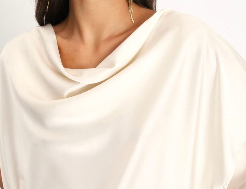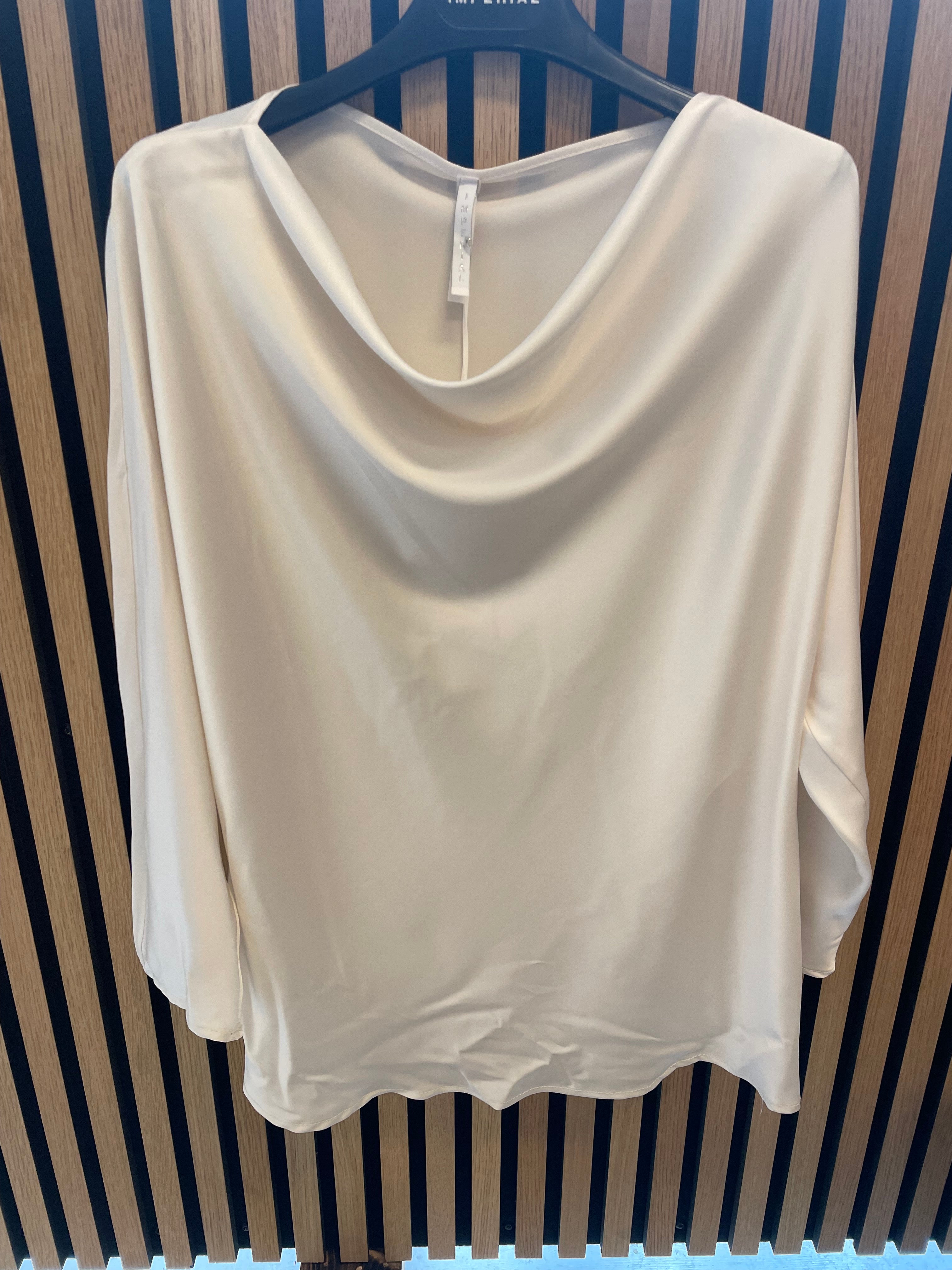 Smuk satin bluse fra italienske Imperial i deres velkendte strygefri kvalitet. Blusen har vandfaldsudskæring ved halsen og falder flot nedover skulderen, som ender ud i et 3/4 ærme.