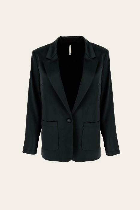 Skøn loose fit blazer fra italienske imperial. Blazeren er i den velkendte strygefri kvalitet og er fremstillet i en flot shiny metervare, der gør den perfekt til de festlige lejligheder. Med lommer fortil og en enkel knap.