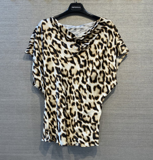 Skøn top fra Italienske Imperial i et fedt leopardprint. Med t-shirt ærmer og vandfald fortil der falder smukt.