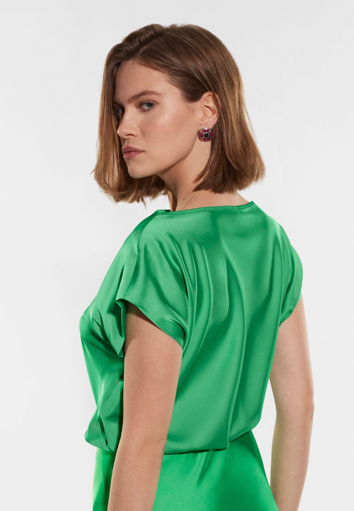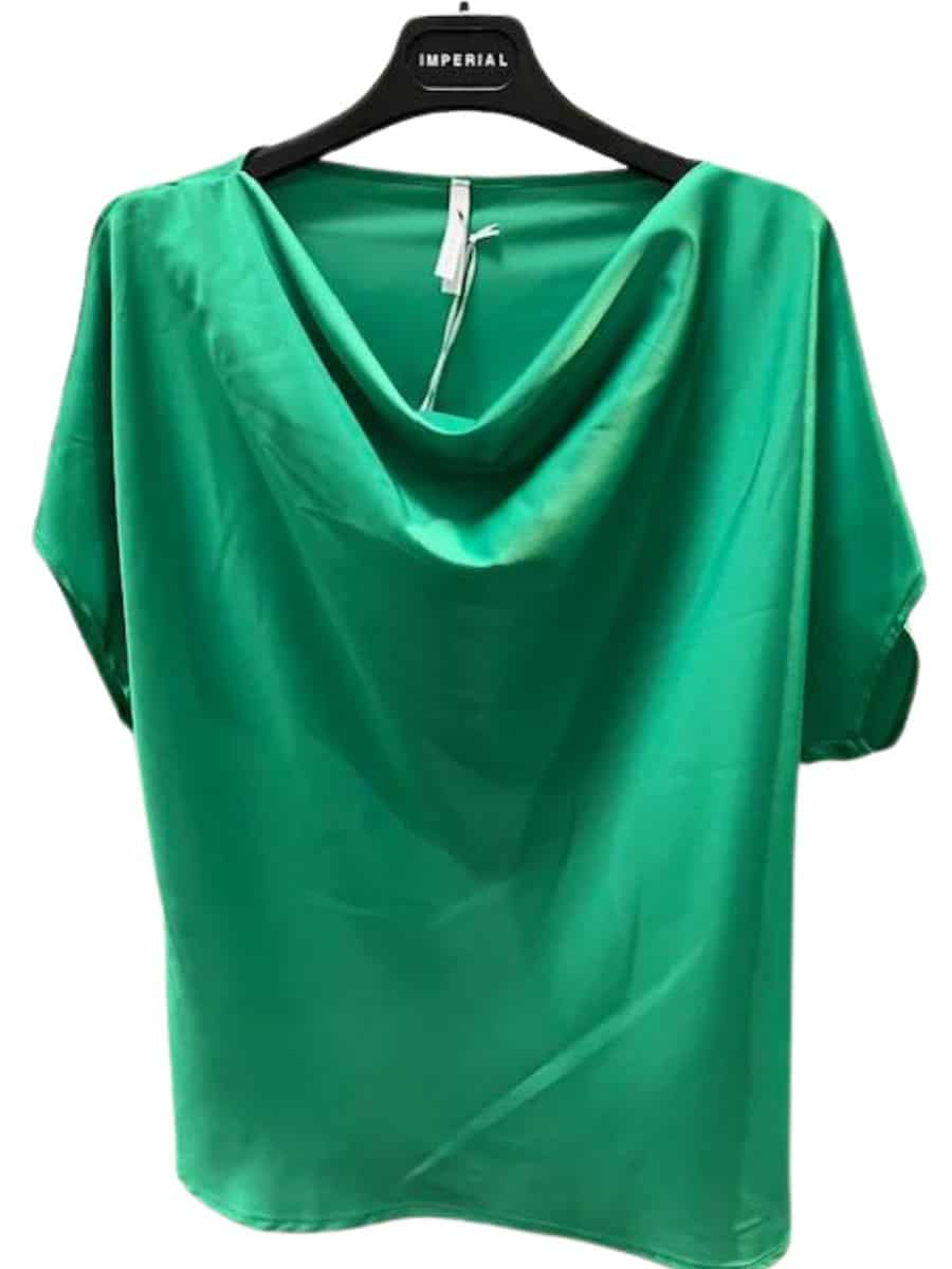 Skøn top fra Italienske Imperial i en smuk grøn farve. Med t-shirt ærmer og vandfald fortil der falder smukt. I Imperials fantastiske strygefri kvalitet.