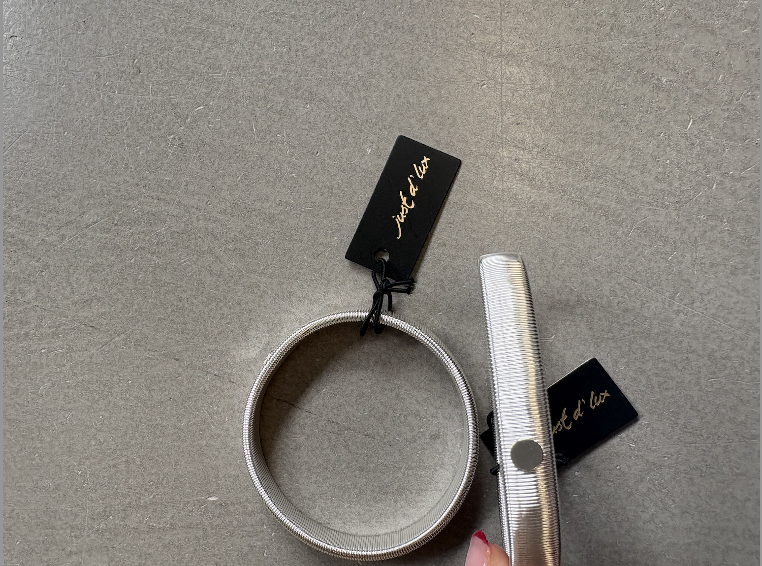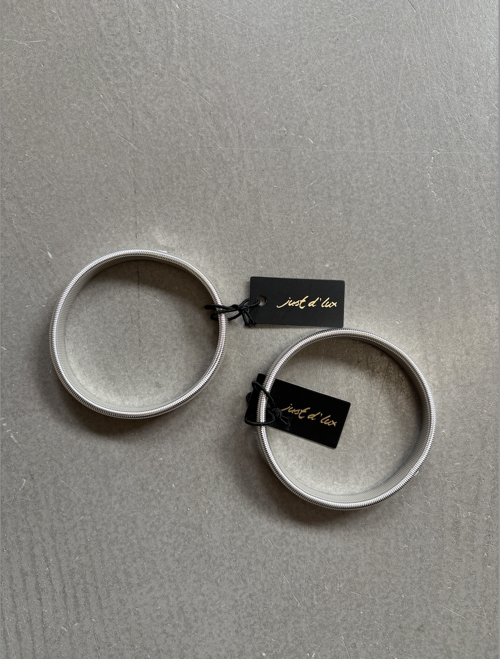Armbåndene fra Just d'lux er elastiske “sleeve cover” armbånd i et enkelt og moderne design. De er formet som runde, lukkede cirkler uden lås og trækkes nemt over hånden, da de er stretchy. Designet består af en fleksibel metalcoil med en ribbet struktur, som giver et rørformet og let tekstureret udtryk i sølvfarvet finish.