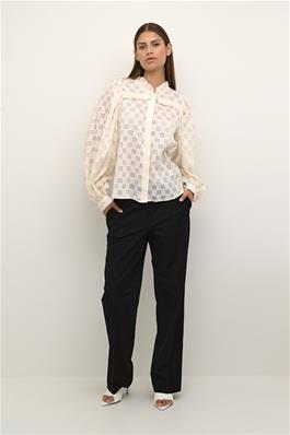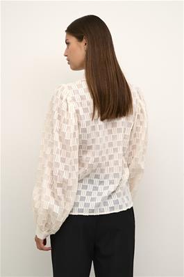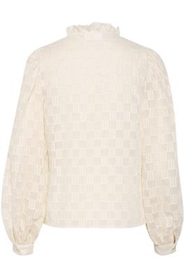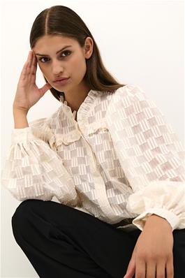 Skøn skjorte fra Karen By Simonsen i off white. Skjorten har et fint tone i tone mønster og flæsedetalje langs kraven.
