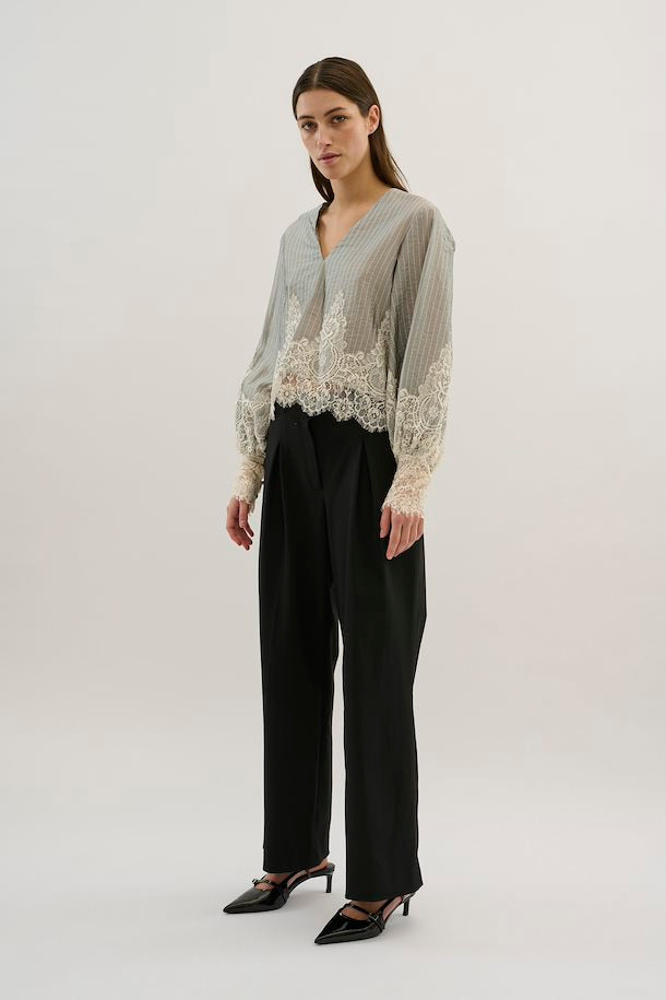 Denne bluse har V-hals, fine blondedetaljer og er vævet i en kort længde med lange ærmer. Den er lavet af 80% viscose og 20% nylon. En tidløs bluse, som er ideel til alle lejligheder. Modellen er 175 cm og bruger størrelse 36/S.
