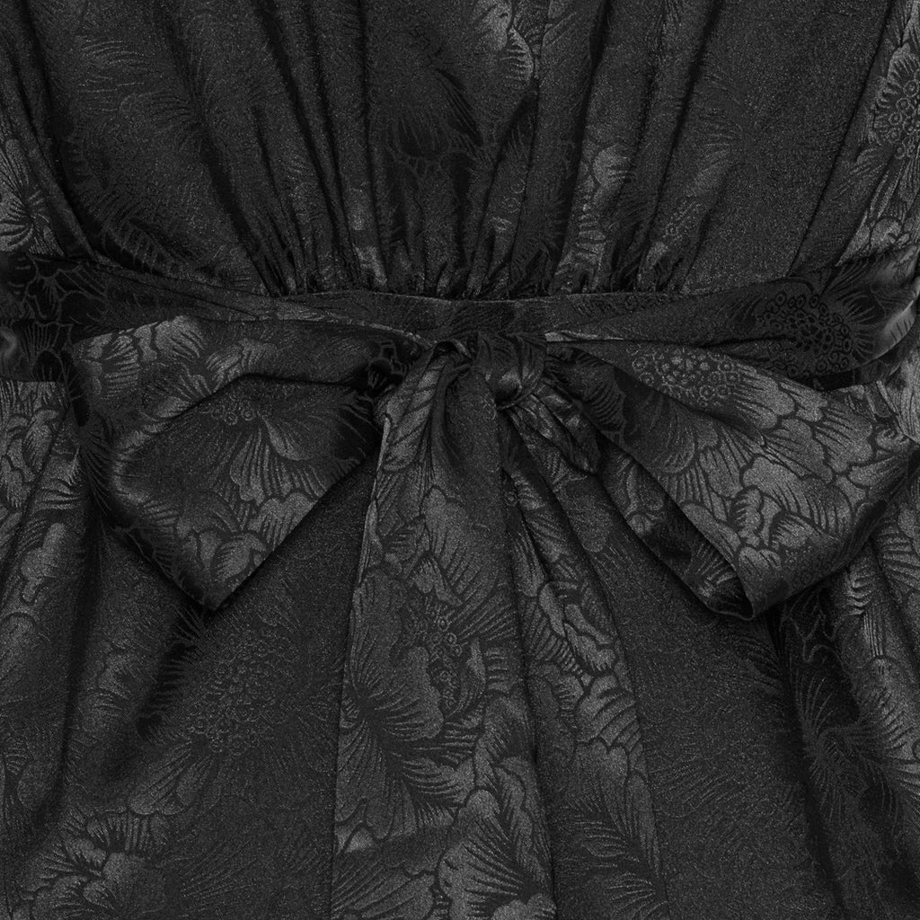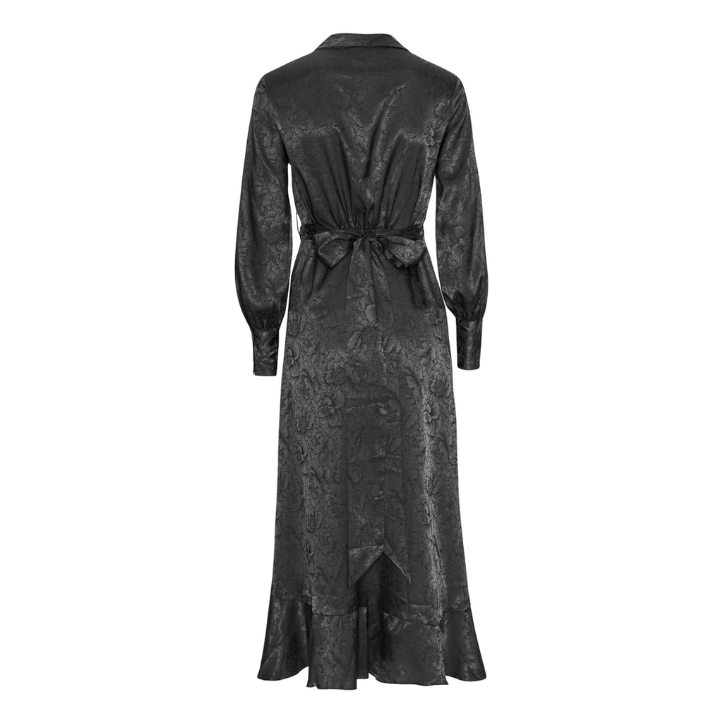 Den smukke Bea kjole fra Karmamia kommer i det fineste diskrete Black Flower Jacquard print. Kjolen er designet med lange ærmer og bindes over i siden ligesom en slå om kjole. Bea dress har den skønneste pasform og en smuk flatterende v-udskæring som giver kjolen et feminint touch! Style den til et par smukke stilletter og du er klar til en enhver festlige begivenhed.