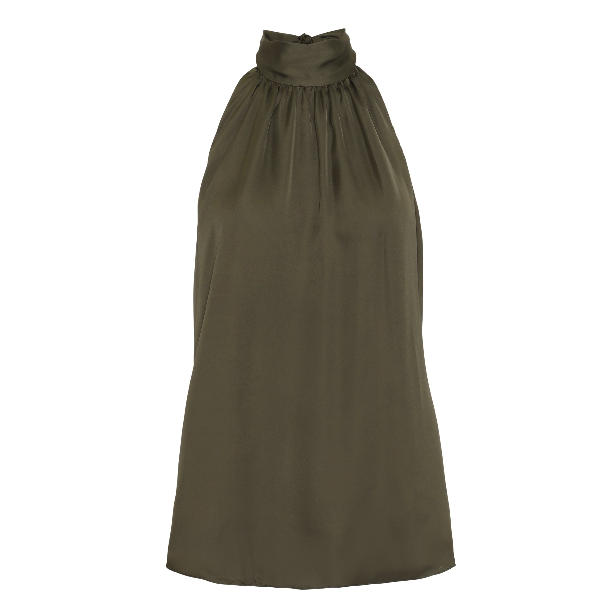 Smuk top fra luksuriøse Karmamia i en flot armygrøn. Denne top er med halterneck der bindes i nakken, samt en pasform der diskret markerer taljen.