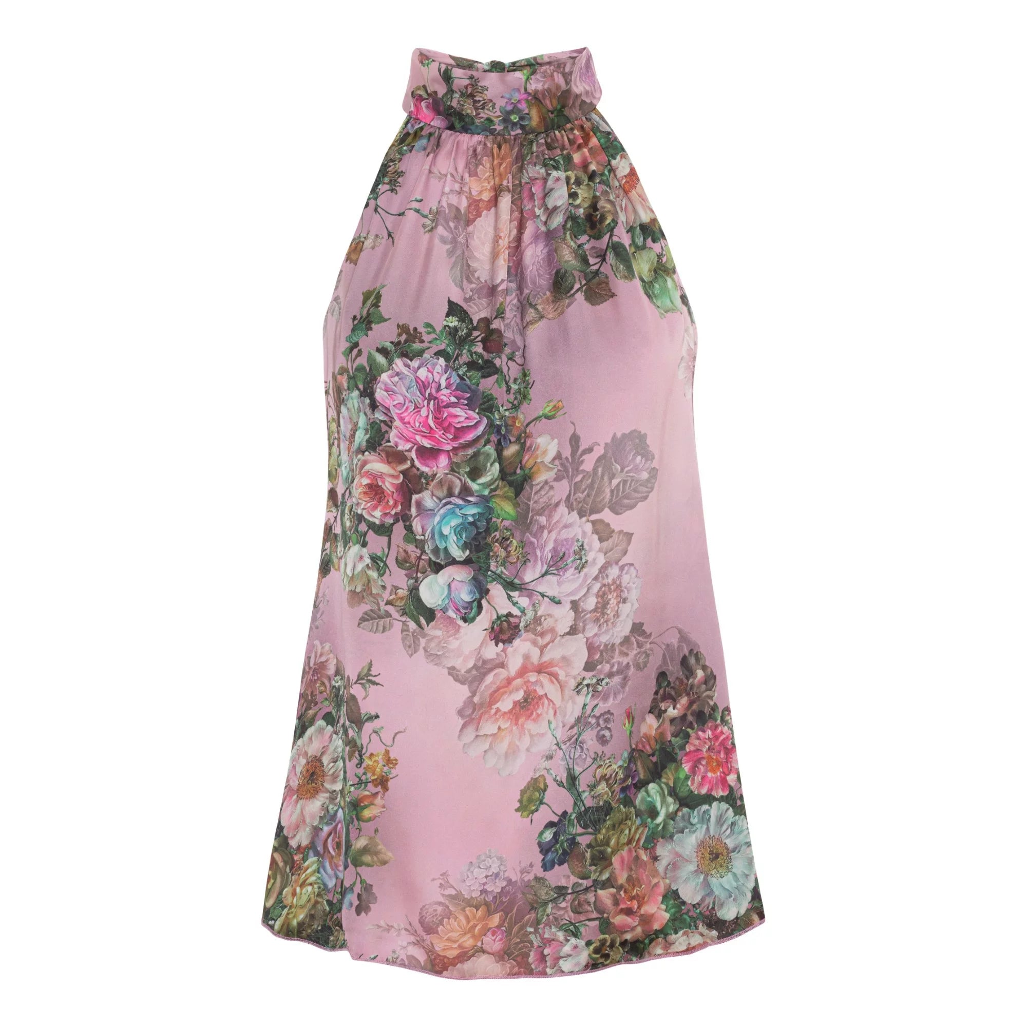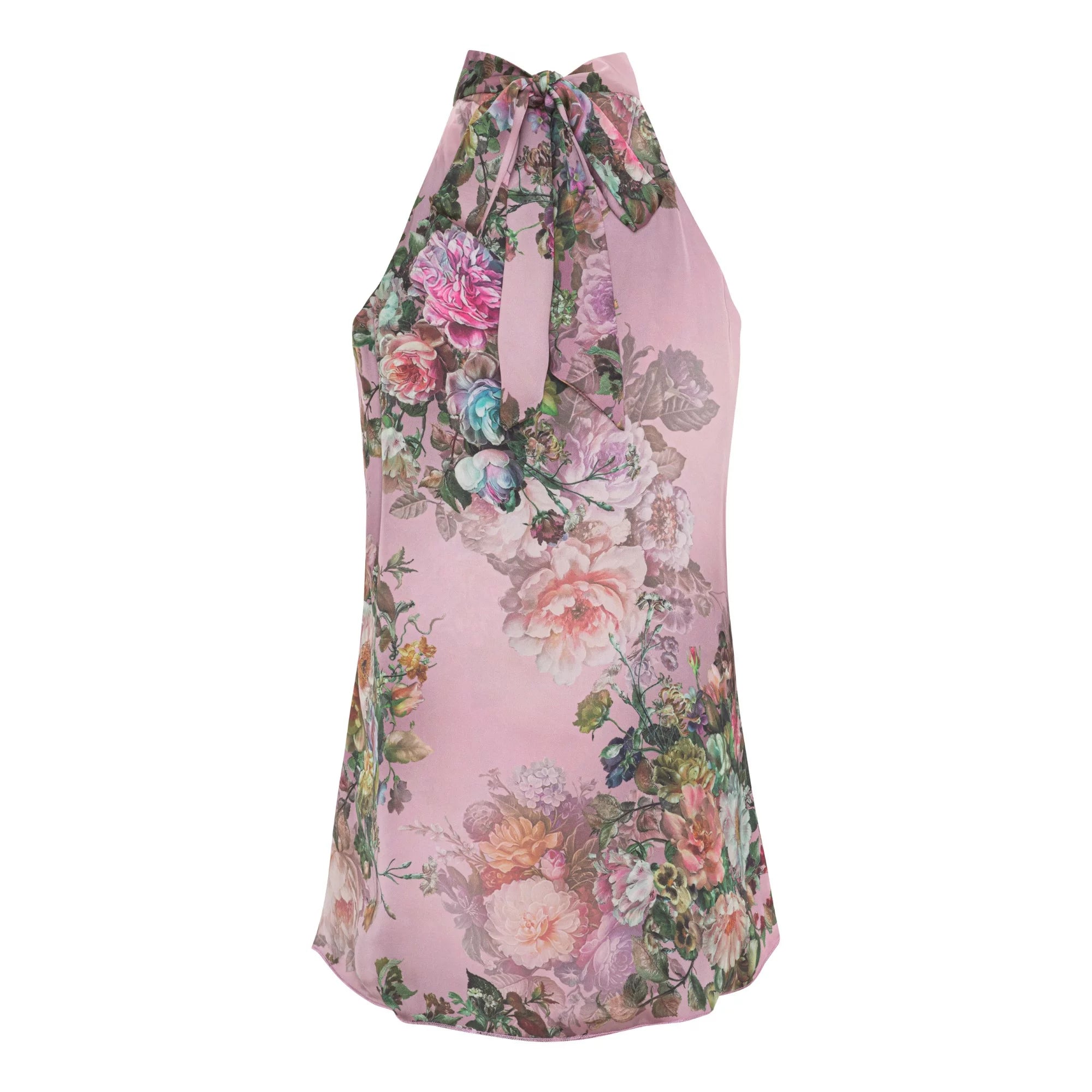 Flatterende top fra luksuriøse Karmamia. Denne top er med halterneck der bindes i nakken, samt en pasform der diskret markerer taljen. Toppen er holdt i gyldne toner med et blomsterprint.