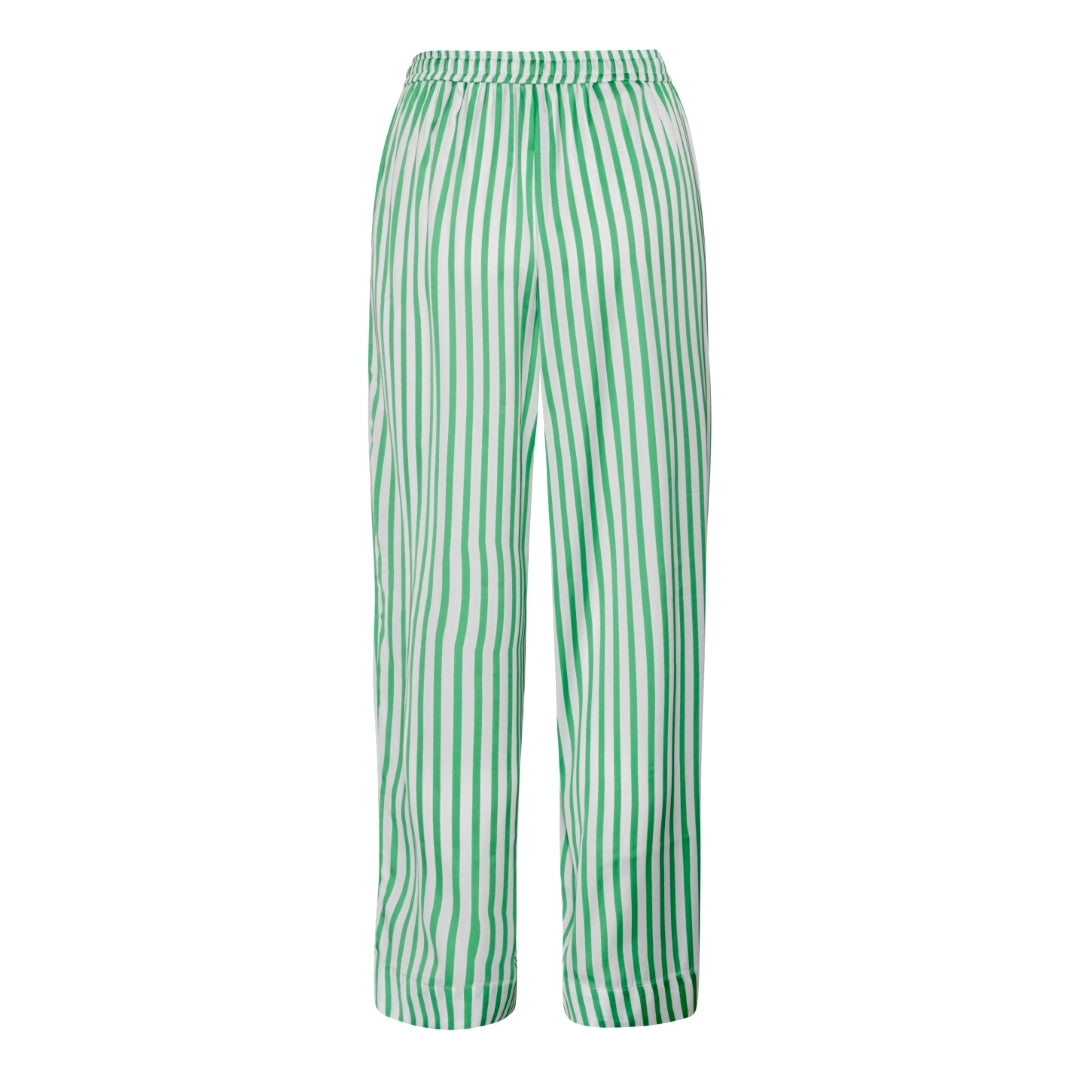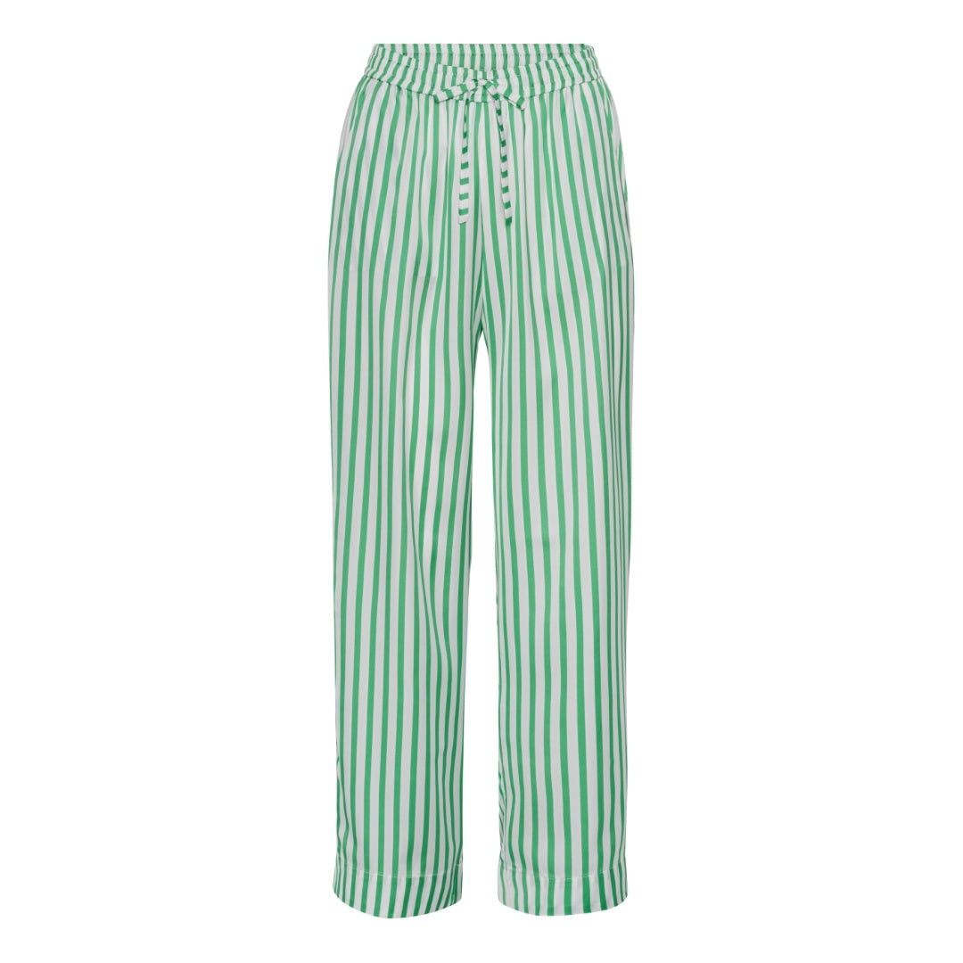 Skønne bukser fra Karmamia i deres velkendte strygefri metervare. Bukserne har vidde i benene, to skrålommer og elastik med snøre i taljen. Og så er de i flotte striber.