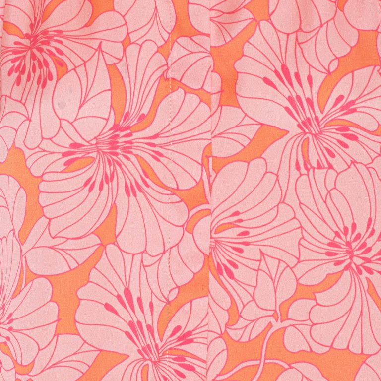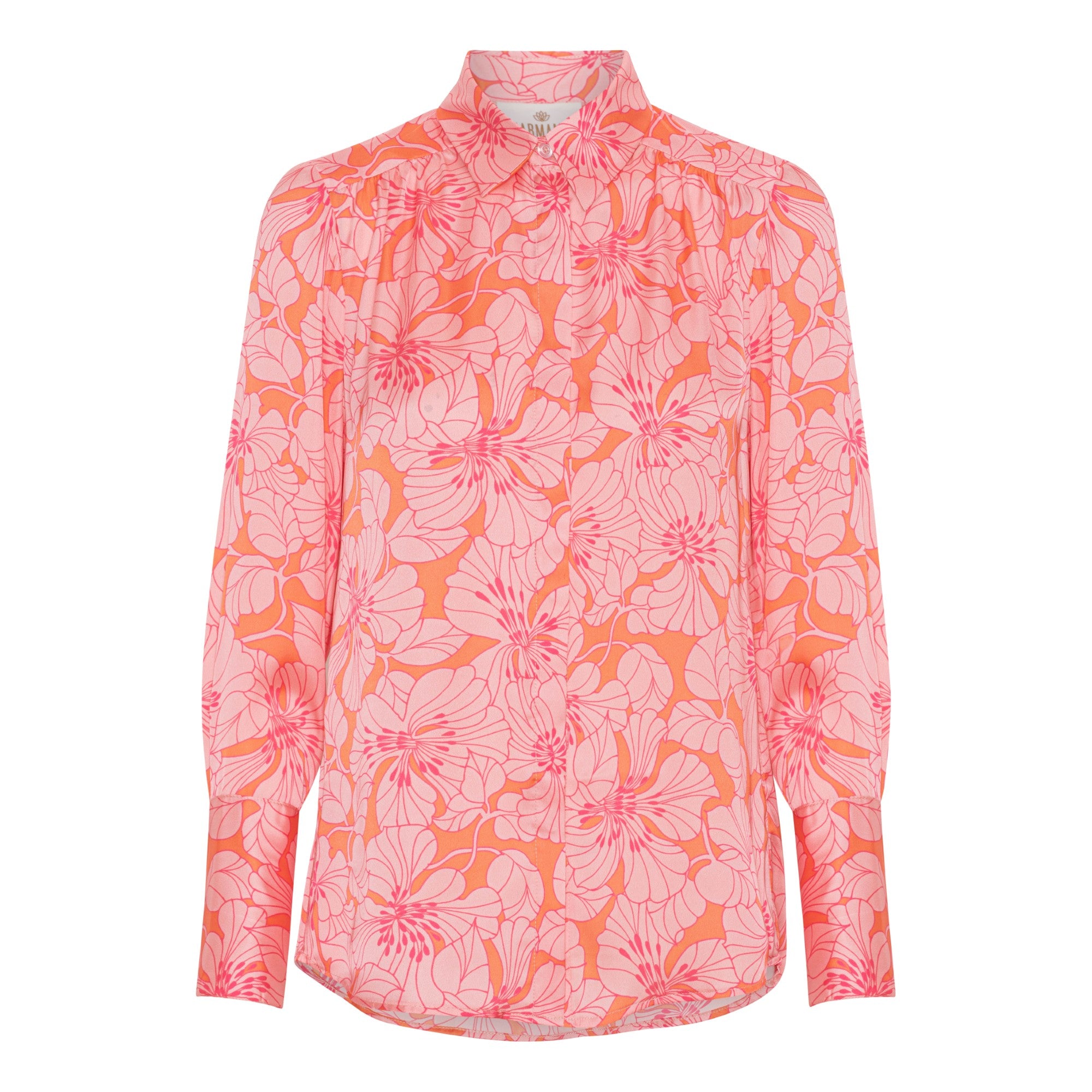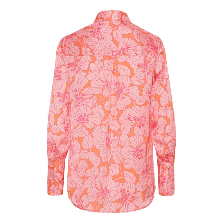 Skøn skjorte fra Karmamia i det smukke krølfire stof. Skjorten er orange med et skøn lyserød blomster mønster og i den skønneste kvalitet. Skjorten har krave og skjult knappelukning, samt bred manchet.