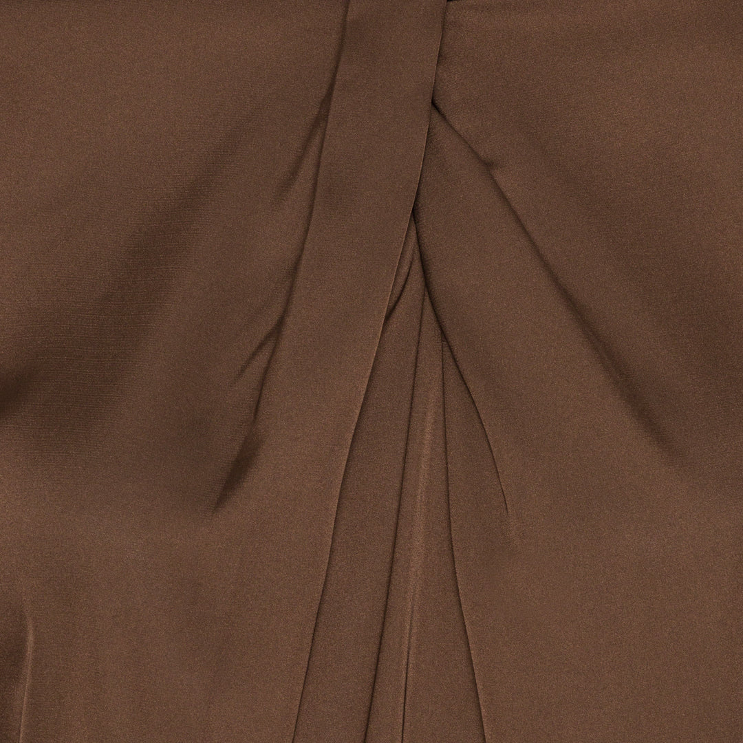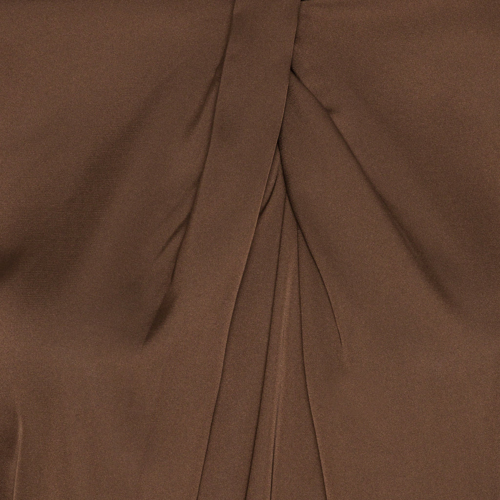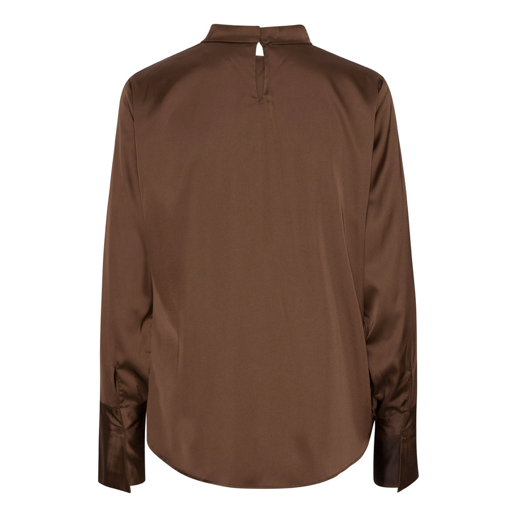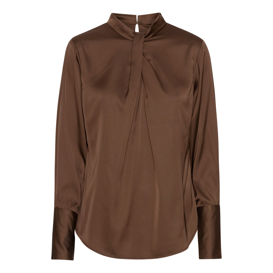 Eksklusiv satinbluse med smuk knudeeffekt ved halsen fra Karmamia. Blusen har lange ærmer, manchetter og kommer i den velkendte strygefri kvalitet.