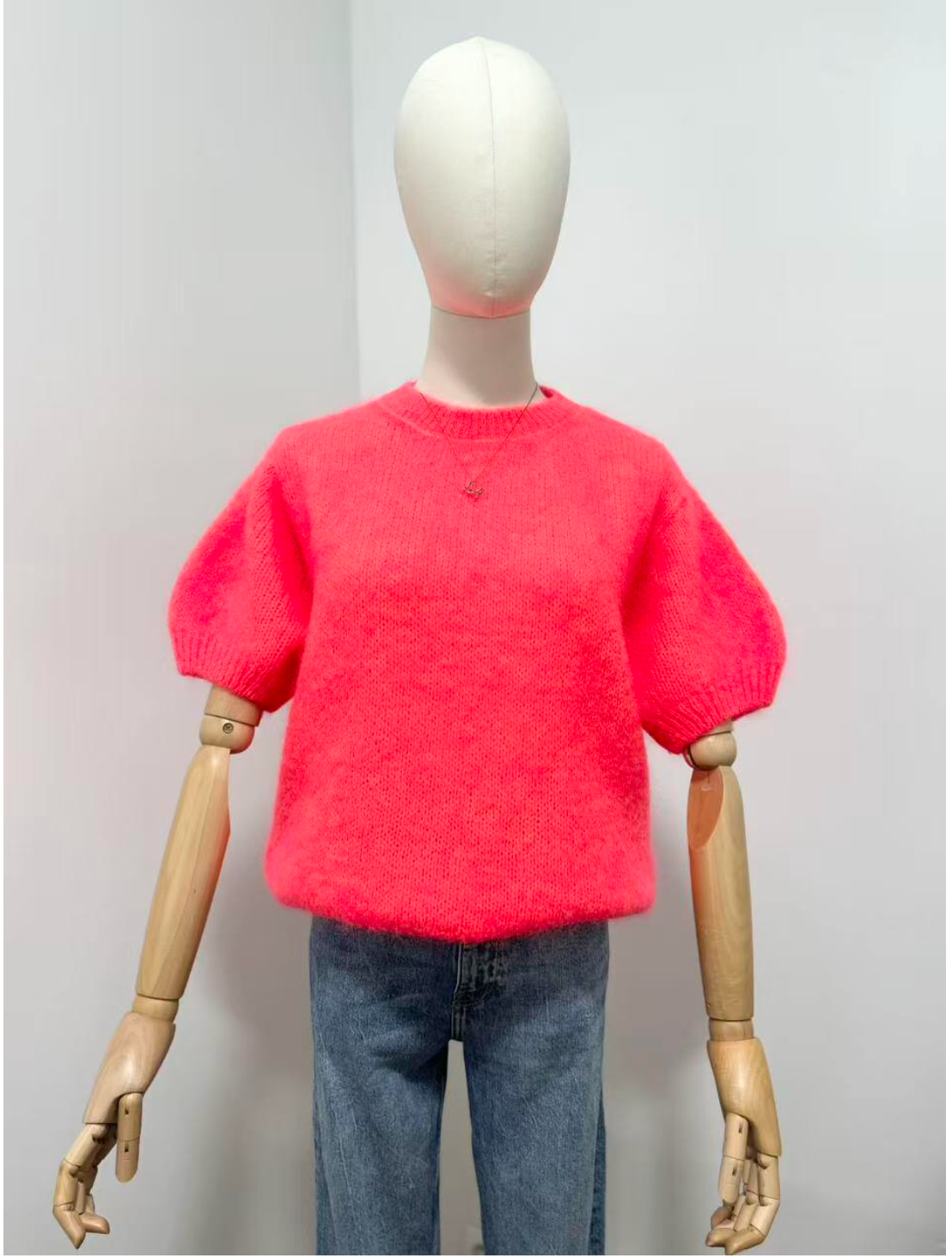 En fluffy mohairstrik med en utrolig blød fornemmelse, let som en sky. Det fjerlette materiale giver en varm fornemmelse, samtidig med at det forbliver luftigt. Den skiller sig ud med sine korte pufærmer, som skaber en smuk volumen og en feminin silhuet, samt sin tidløse runde halsudskæring, der er nem at bruge til hverdag.