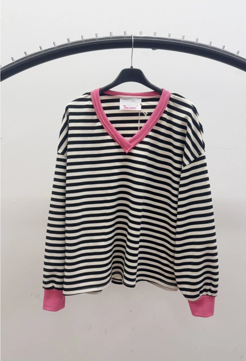 Stribet sweatshirt i sort og hvid med afslappet pasform. Modellen har V-hals med kontrastfarvet pink kant samt matchende pink ribkanter ved ærmerne, som giver et feminint og moderne twist. Blusen er fremstillet i en blød og strækbar kvalitet med bomuld, polyester og elastan, hvilket sikrer god komfort og bevægelsesfrihed. Perfekt til et casual hverdagslook.