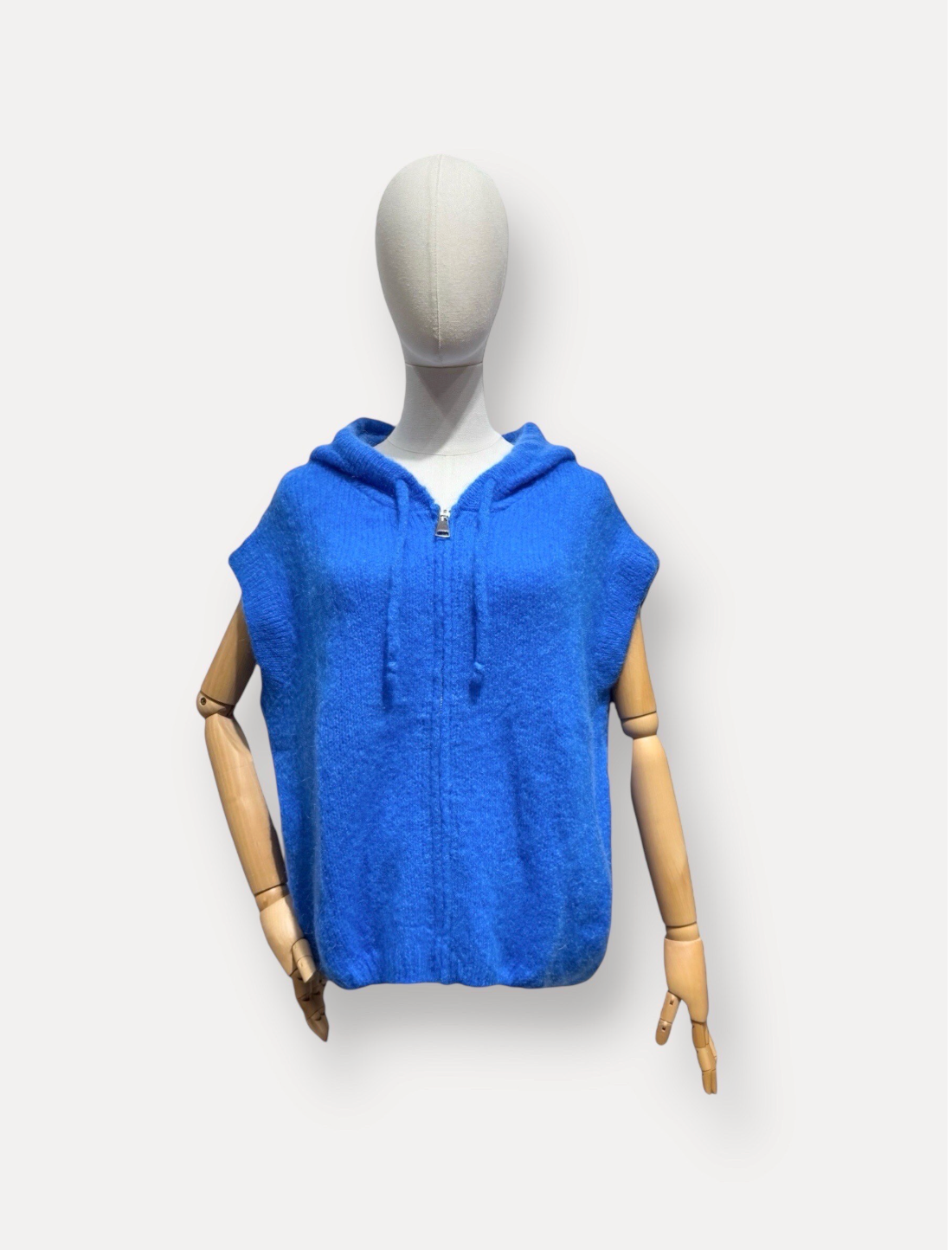 Denne vest er en strikket, ærmeløs hoodie‑vest med lynlås foran og en stor, meget fluffy hætte, der giver et blødt og hyggeligt udtryk. Vesten har en ensfarvet finish, hvilket skaber et klassisk og stilrent look. Med sit kombinerede design af hoodie og vest fungerer den perfekt som lag‑på‑lag‑piece, både praktisk og moderigtig.