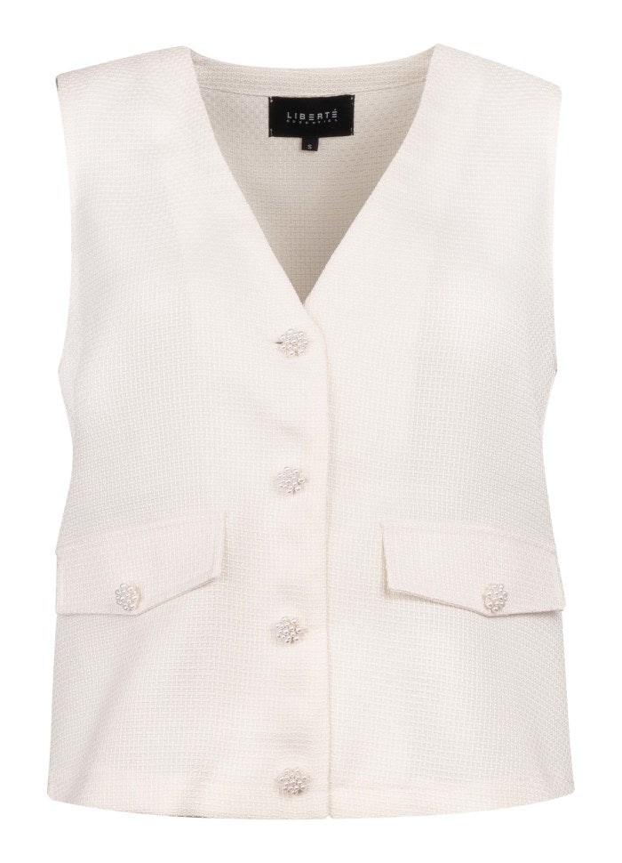 Cool vest fra Liberté i en klassisk creme farvet. Med lommetaljer fortil og smukke perleknapper fortil.