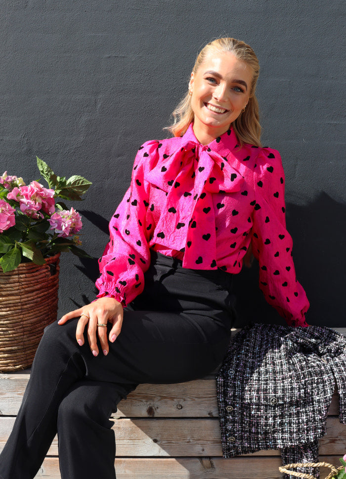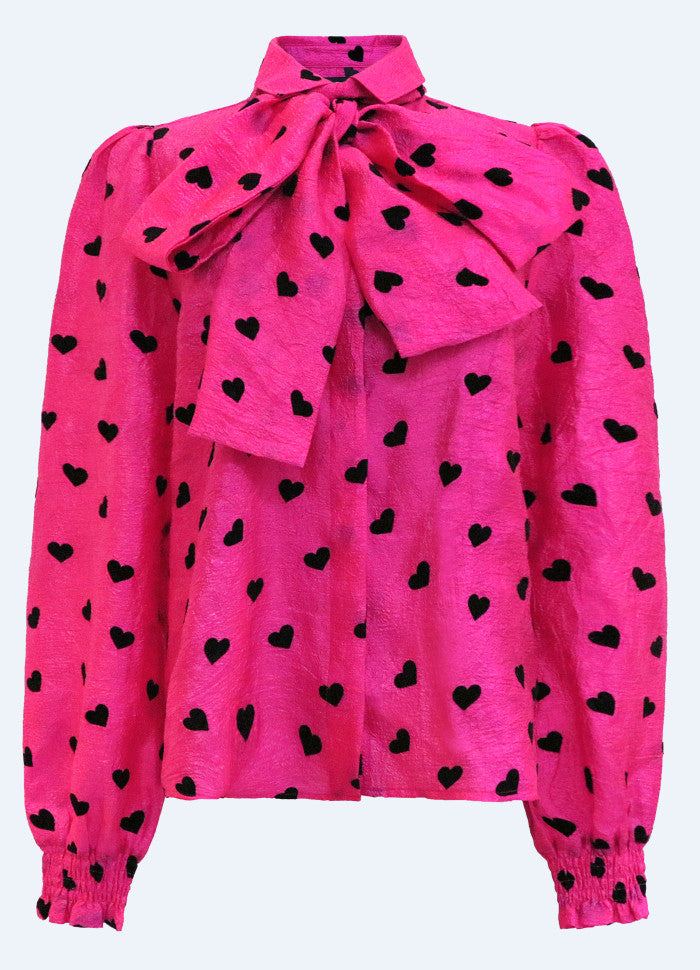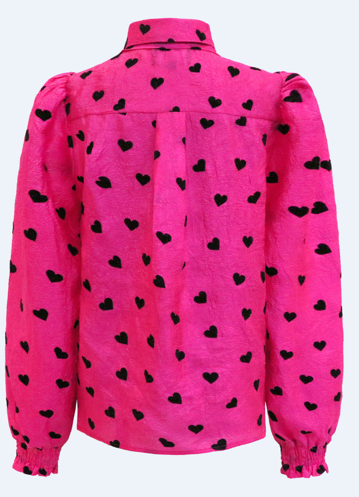 Flot bluse fra Liberté i en skøn pink farve med hjerter. Blusen har let puff ved skulderne og smock ved armeafslutning.