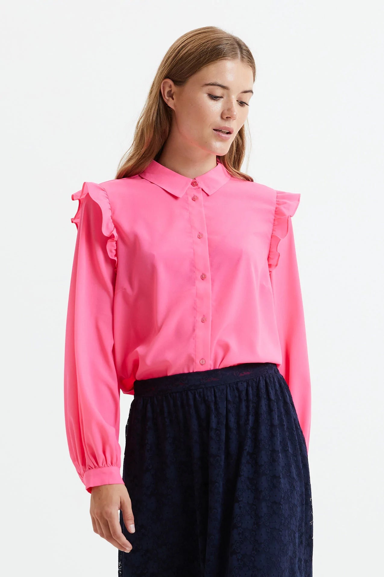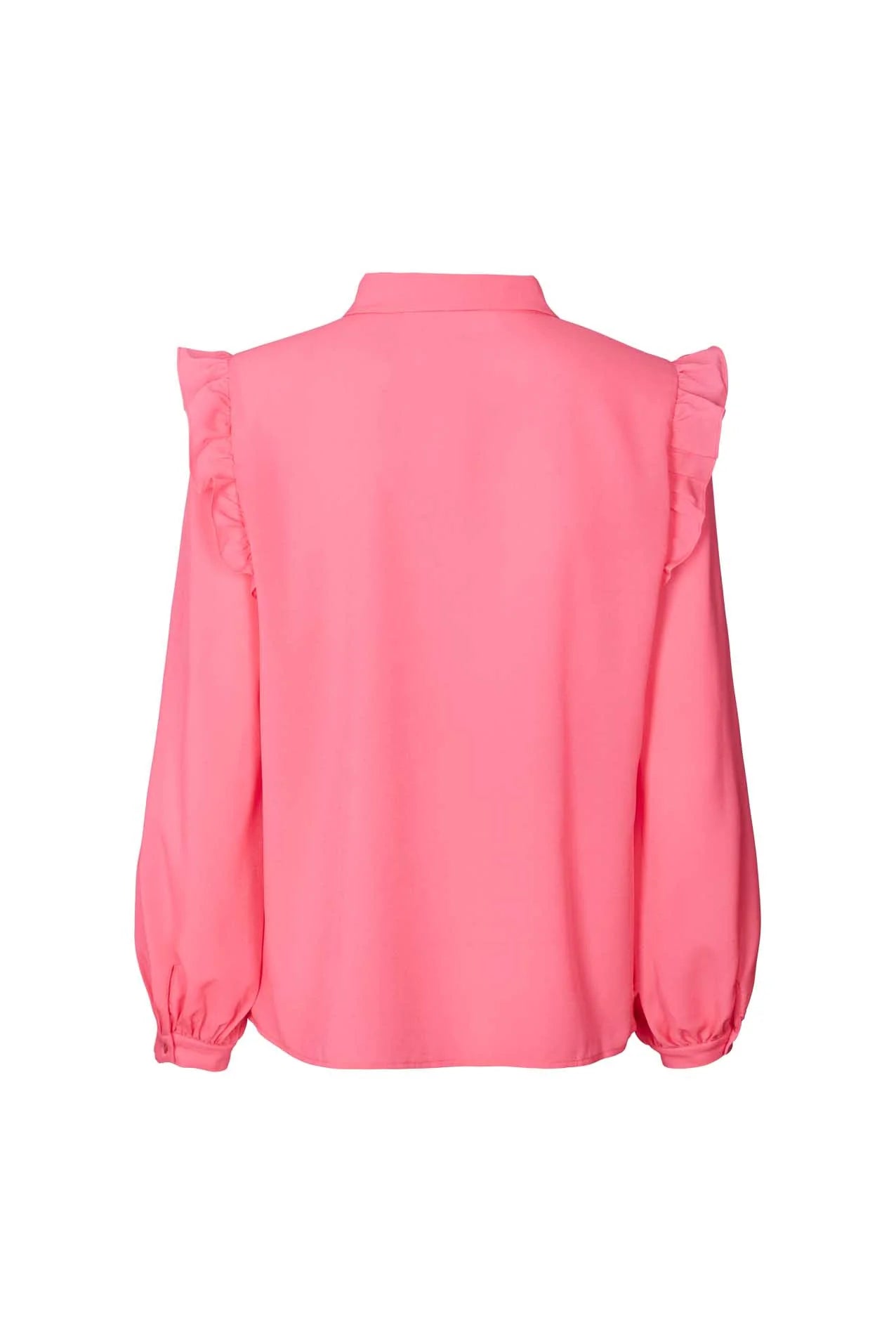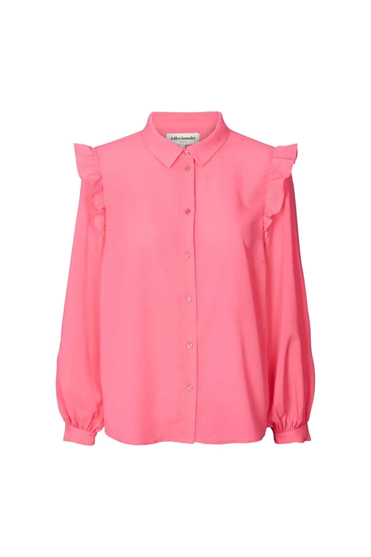 Alexis skjorte har lange ærmer med volumen og manchetter. Desuden en krave og en frontåbning med knapper. Det, der gør denne style unik, er farven og flæserne ved skuldre og øverste ærmer. En klassiker med et dejligt twist af Lollys.