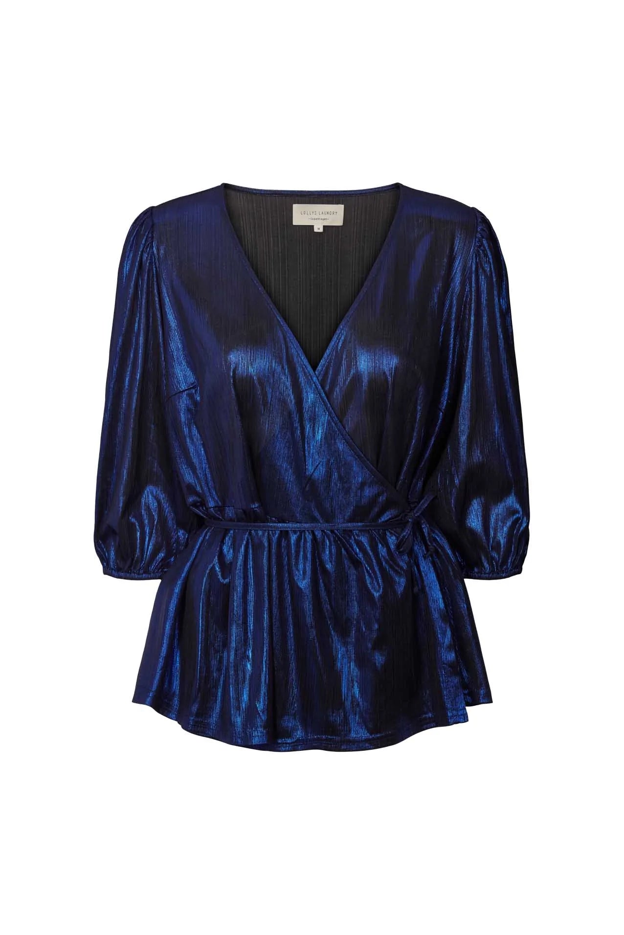 Denver bluse har 3/4 ærmer med elastik og v-udskæring. Det er en cool og feminin slå-om-bluse med båndlukning og subtile rynker ved skuldrene. Den er lavet i et strækbart materiale og pasformen er normal.