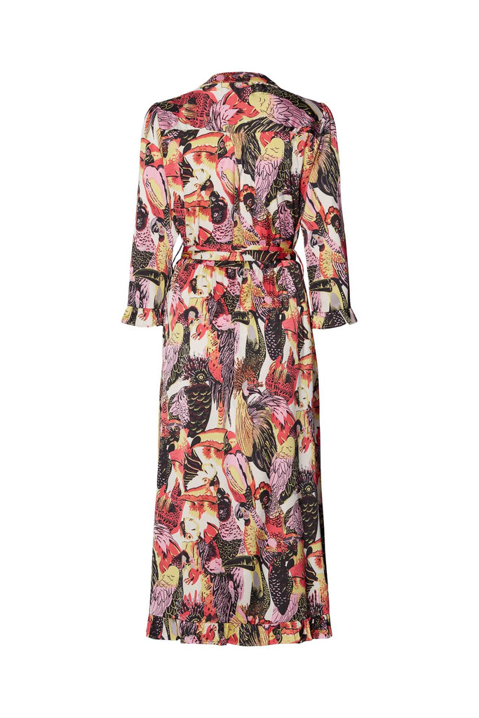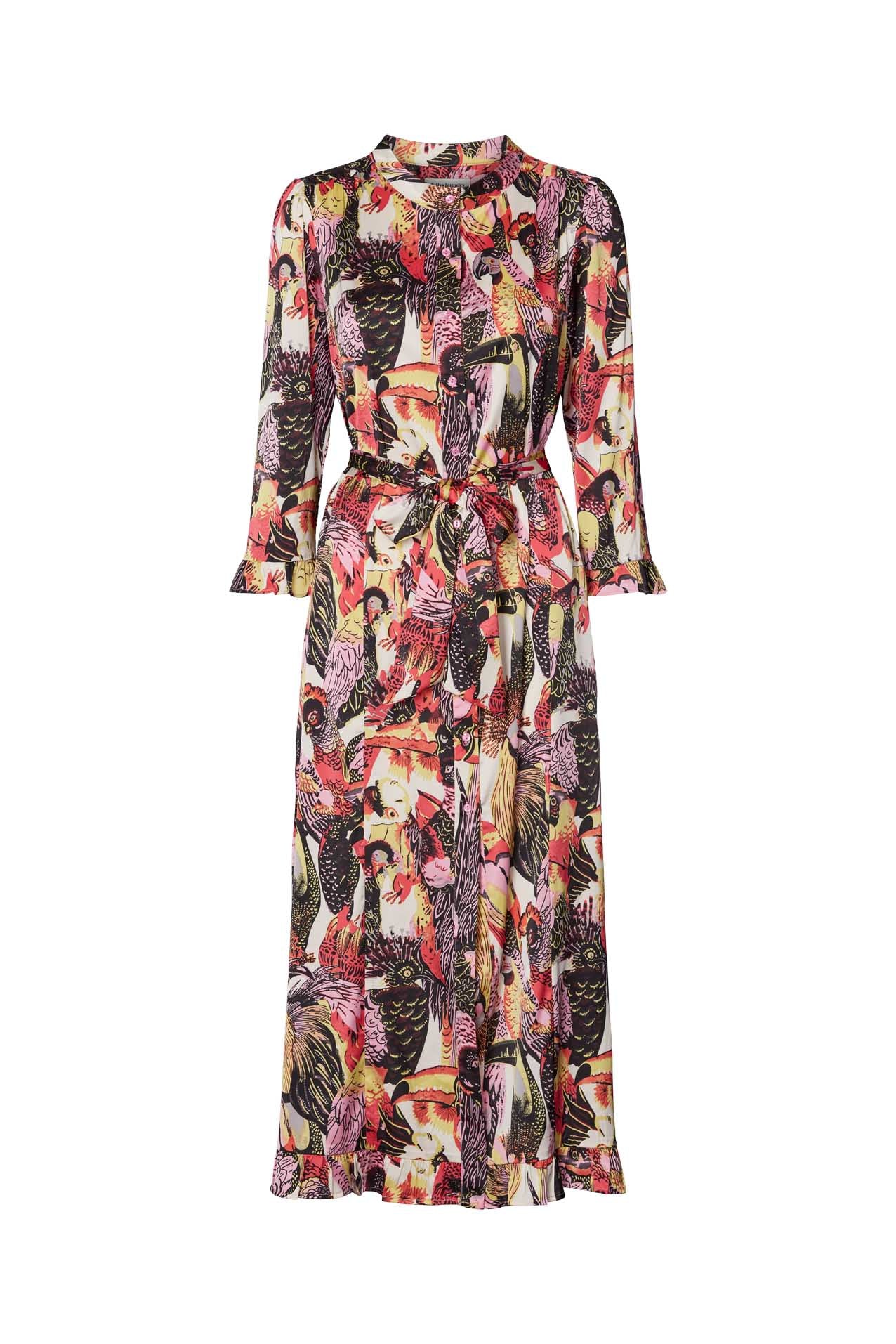 Smuk kjole fra lollys laundry i det skønneste sommerprint. Kjolen er gennemknappet og har længe ærmer med flot flæsedetalje. Taljebånd medfølger.