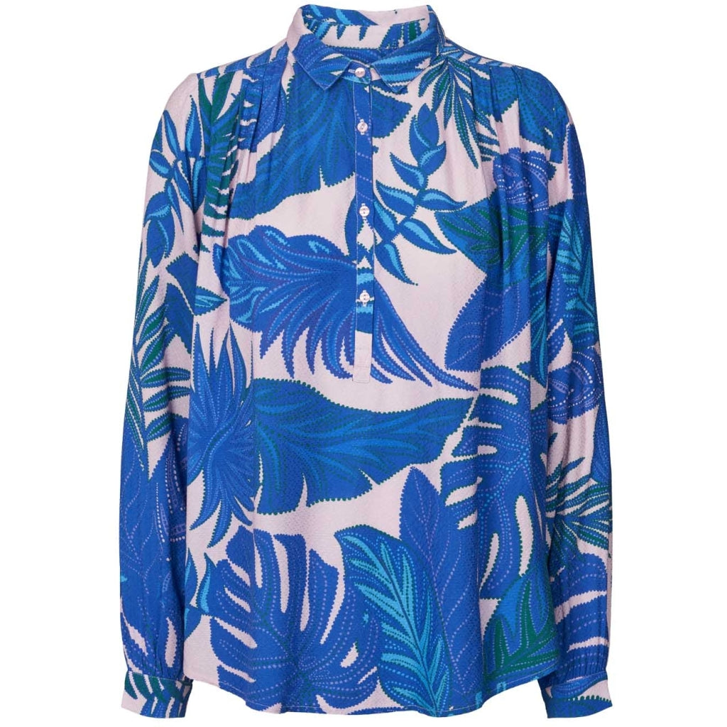 Skøn bluse i viskose fra Lollys laundry i en smuk blå farve. Blusen har en løs pasform, krave og stolpelukning fortil.