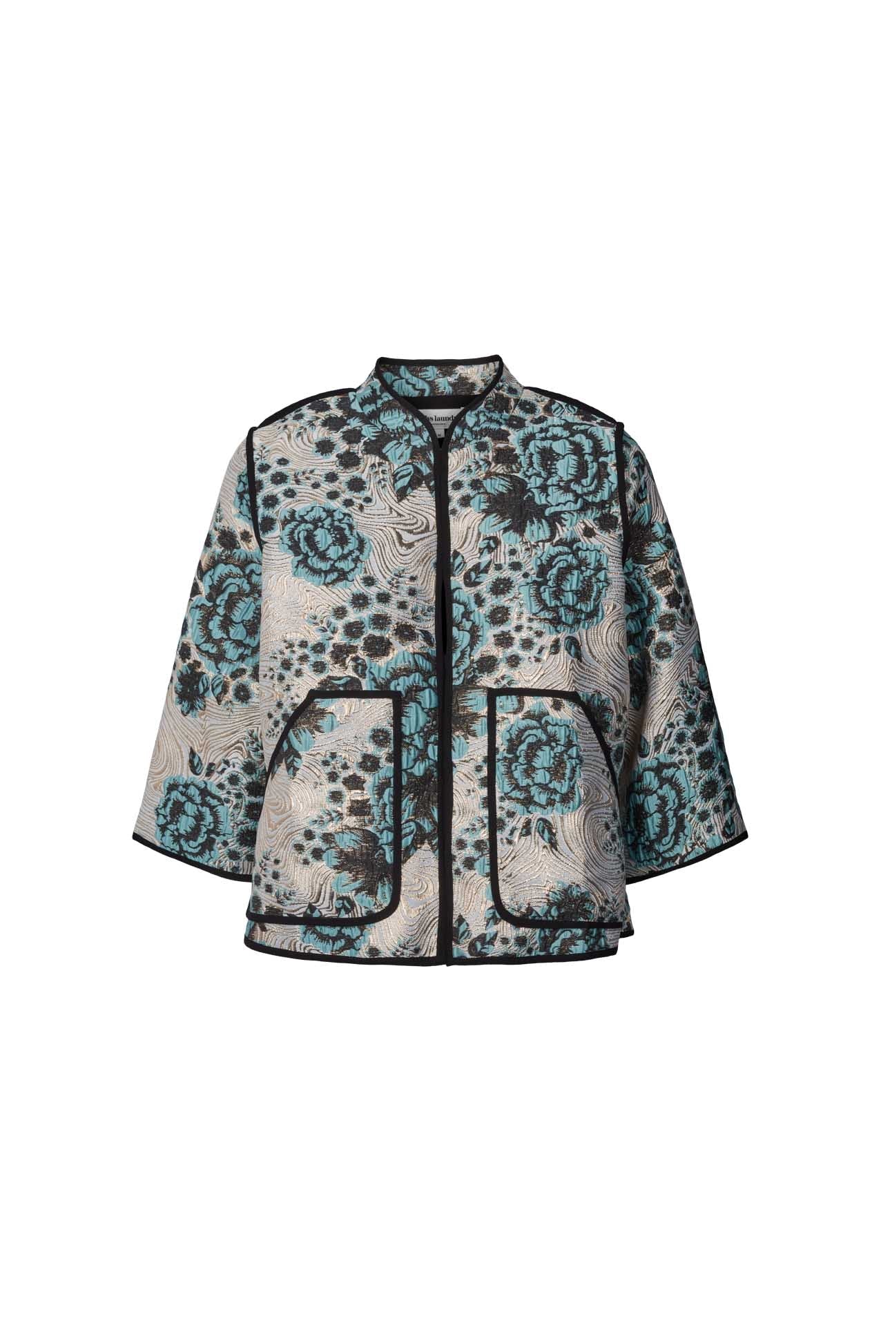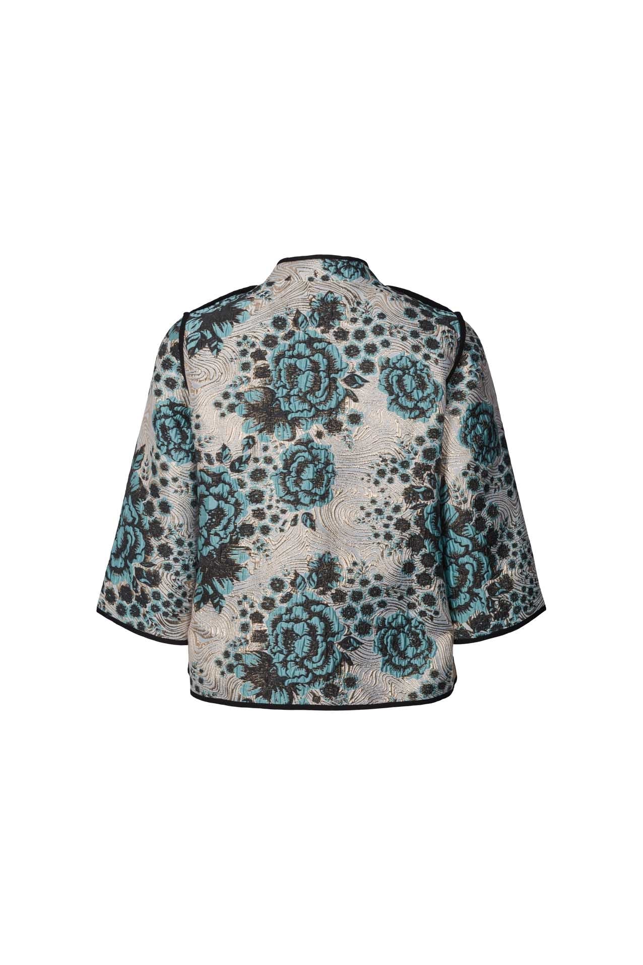 Vi er helt vilde med Miriam jacket lavet i et unikt print med synlige kontrastfarver. Jakken er designet med åben front, 3/4 ærmer og en lille krave. Den er kort, men normal i størrelsen og smukt stylet som et sæt med vores Aqua skirt.