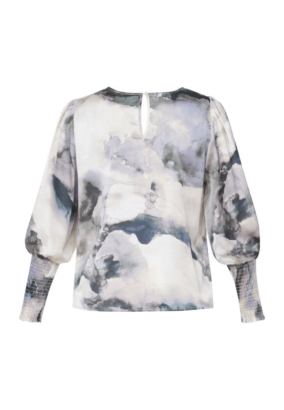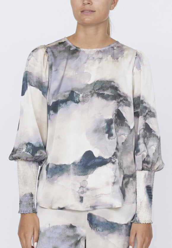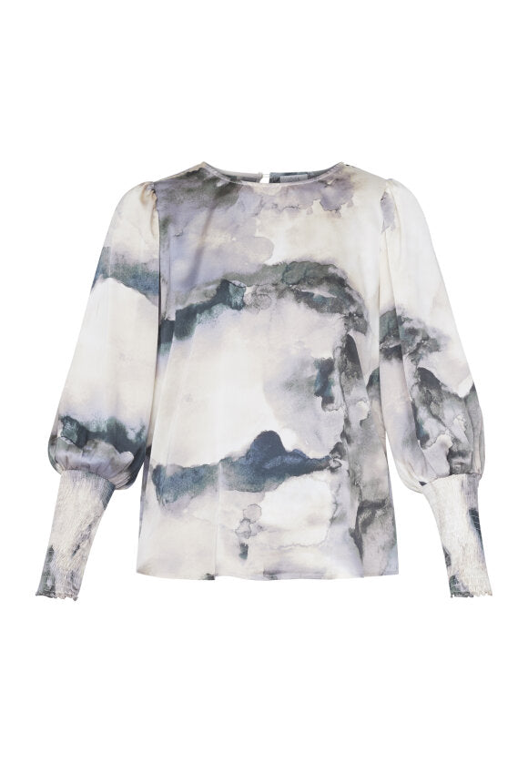 Den smukkeste bluse fra Love & Divine i waterprint med en løs pasform. Blusen har rund hals med en lille knappelukning i nakken, lang smock detalje ved håndleddene og en fin rundning i bunden.