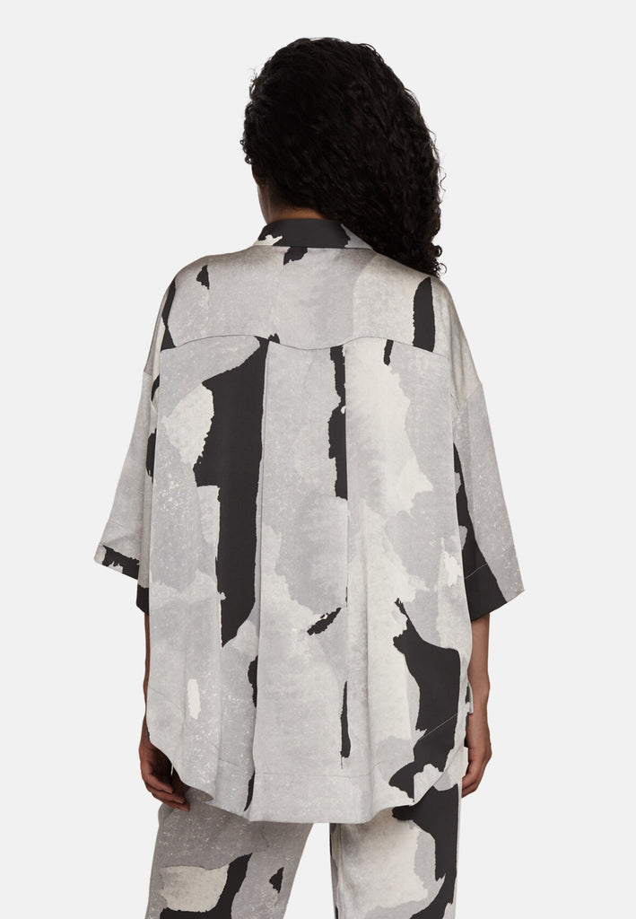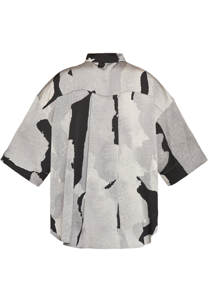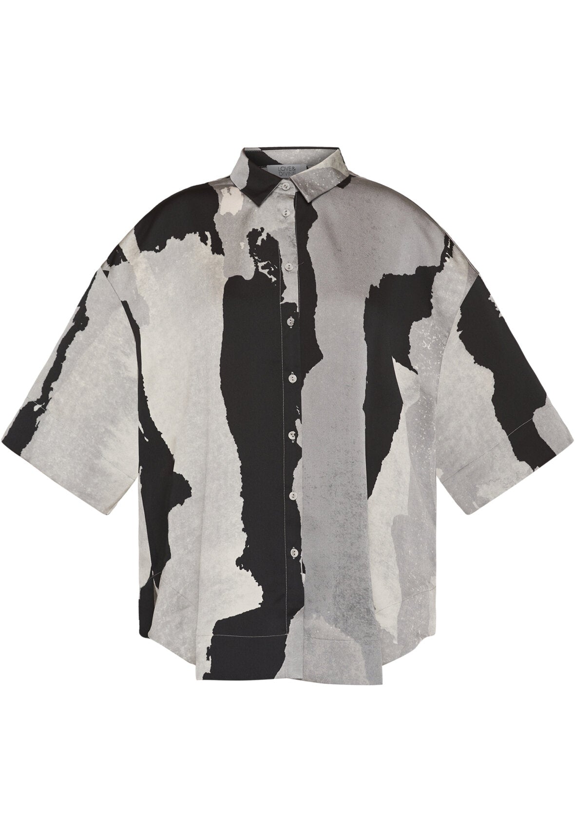 Lækker bluse fra Love & Divine i et smukt gråt mønster med sorte og off white nuancer. Blusen har en oversize pasform og løse t-shirt ærmer, der går til omkring albuen. Derudover har den en runding forneden, et lille slids op i hver side, og en klassisk krave.