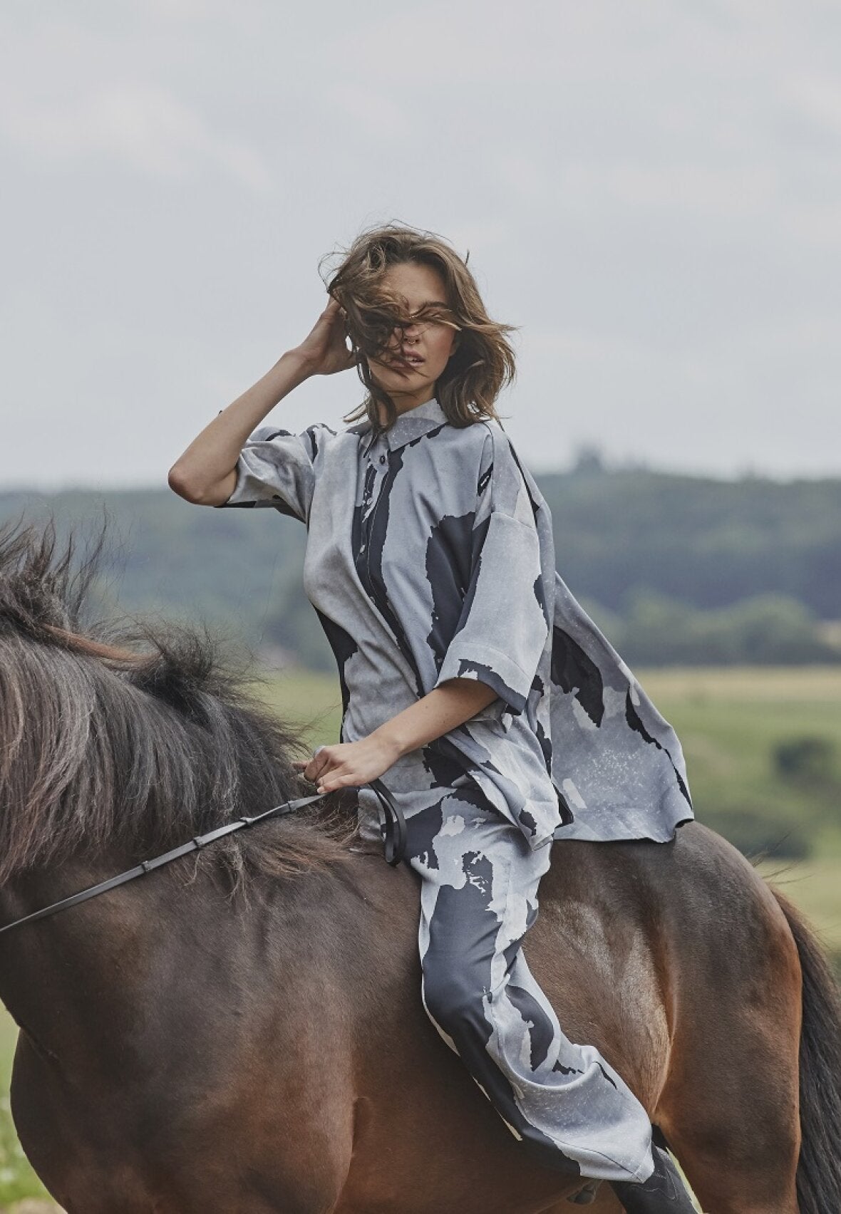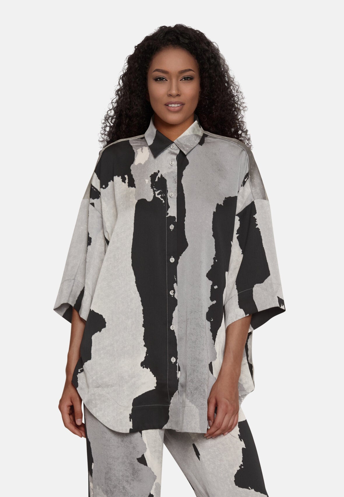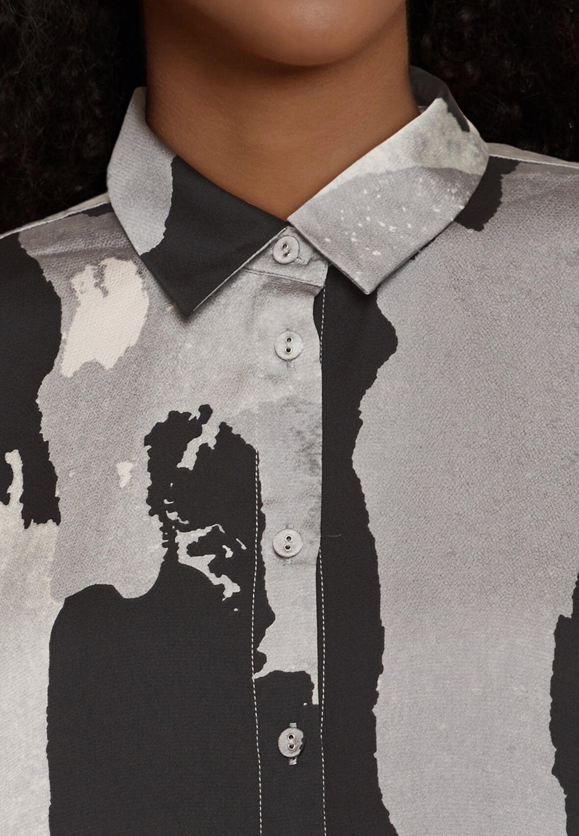 Lækker bluse fra Love & Divine i et smukt gråt mønster med sorte og off white nuancer. Blusen har en oversize pasform og løse t-shirt ærmer, der går til omkring albuen. Derudover har den en runding forneden, et lille slids op i hver side, og en klassisk krave.