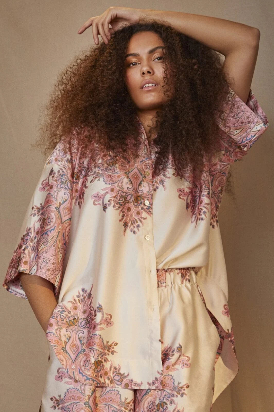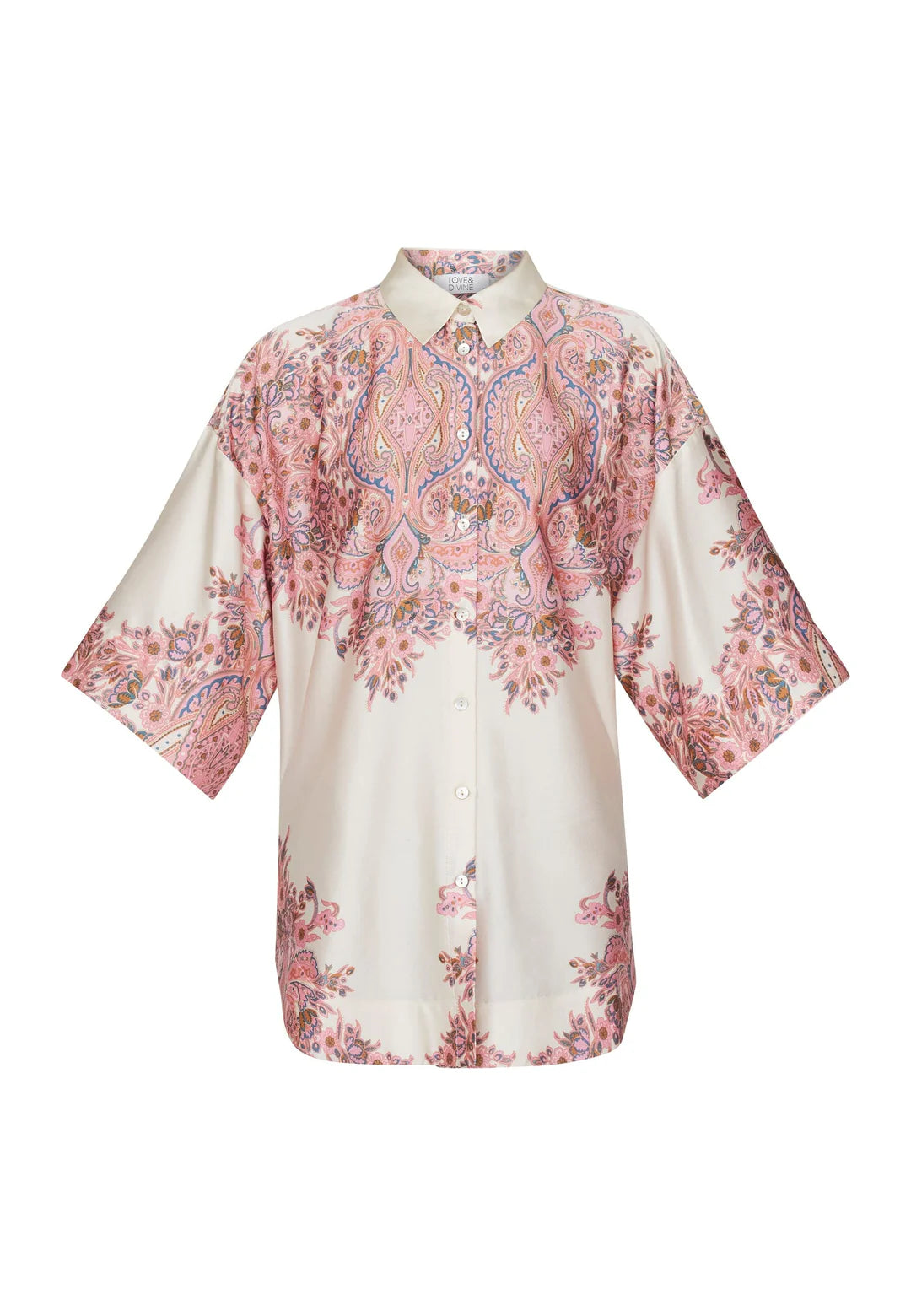 Lækker bluse fra Love & Divine i et smukt pink mønster. Blusen har en oversize pasform og løse t-shirt ærmer, der går til omkring albuen. Derudover har den en runding forneden, et lille slids op i hver side, og en klassisk krave.